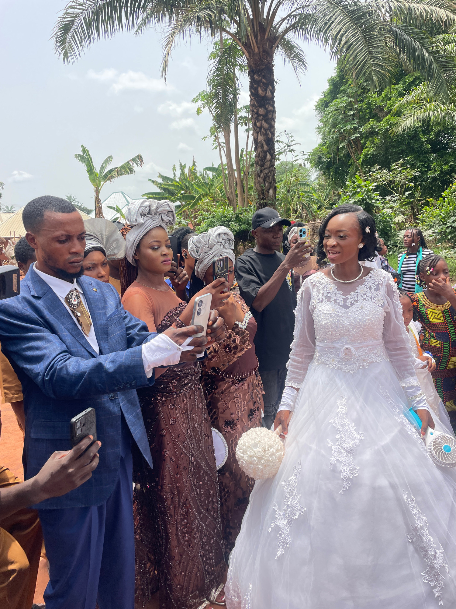 A medium shot depicts a wedding scene in Ogbe, Nigeria. The bride is dressed in a white gown with lace detailing and a pearl necklace. She is surrounded by people who are taking photos of her with the…read more