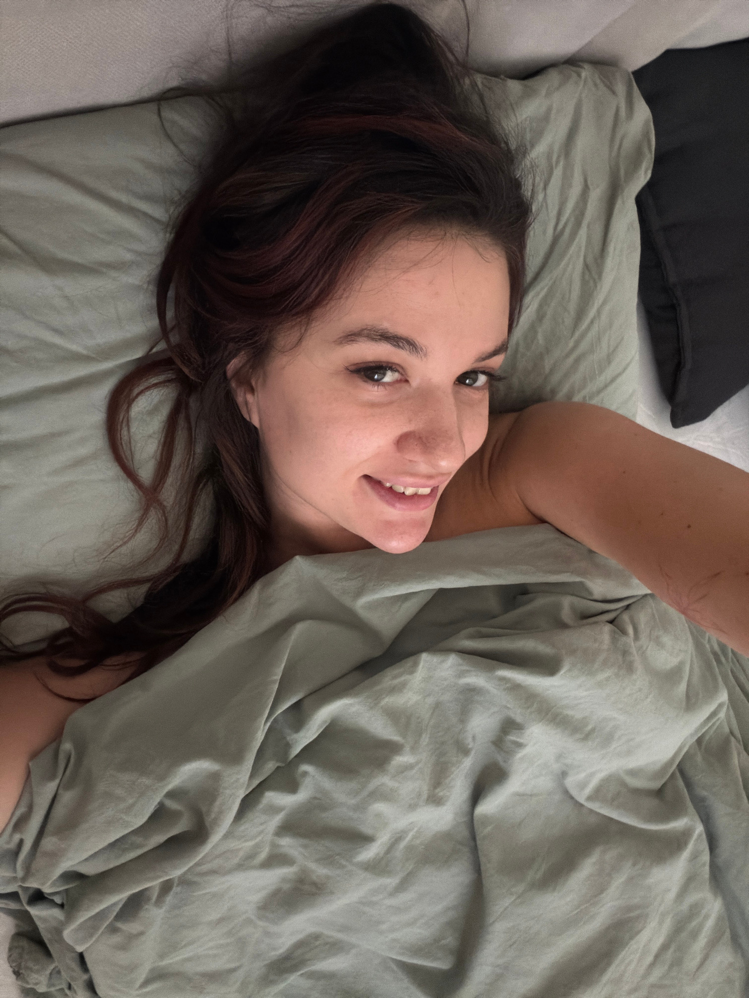 A young woman is lying in bed, partially covered by a light green duvet. Her head is on a matching light green pillow. She has long, wavy dark brown hair and is smiling. A black pillow is visible near…read more