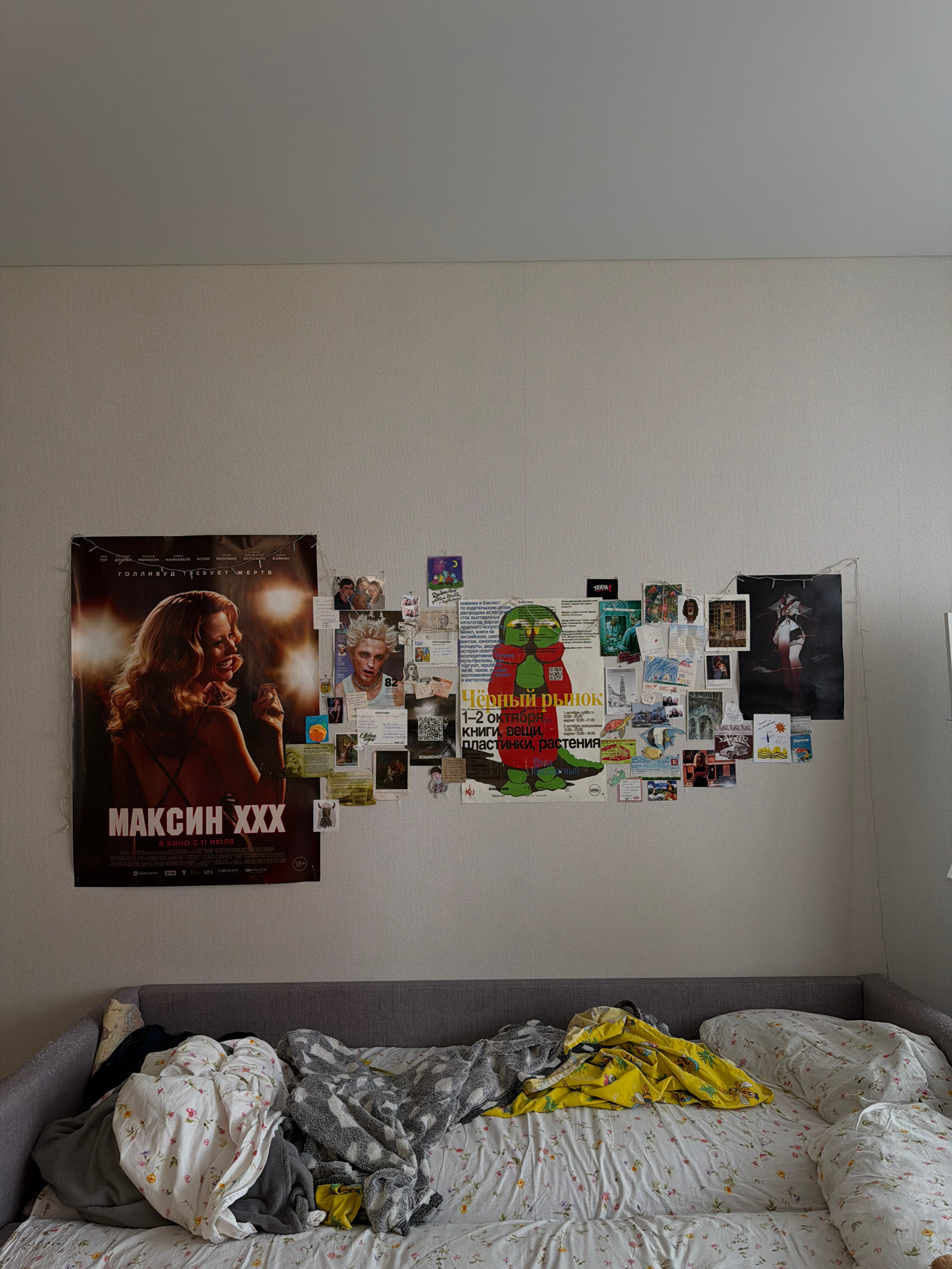 The image presents an overhead view of a room, likely a bedroom, featuring a decorated wall and an adjacent unmade bed. The wall, covered in light grey textured wallpaper, is adorned with a large coll…read more