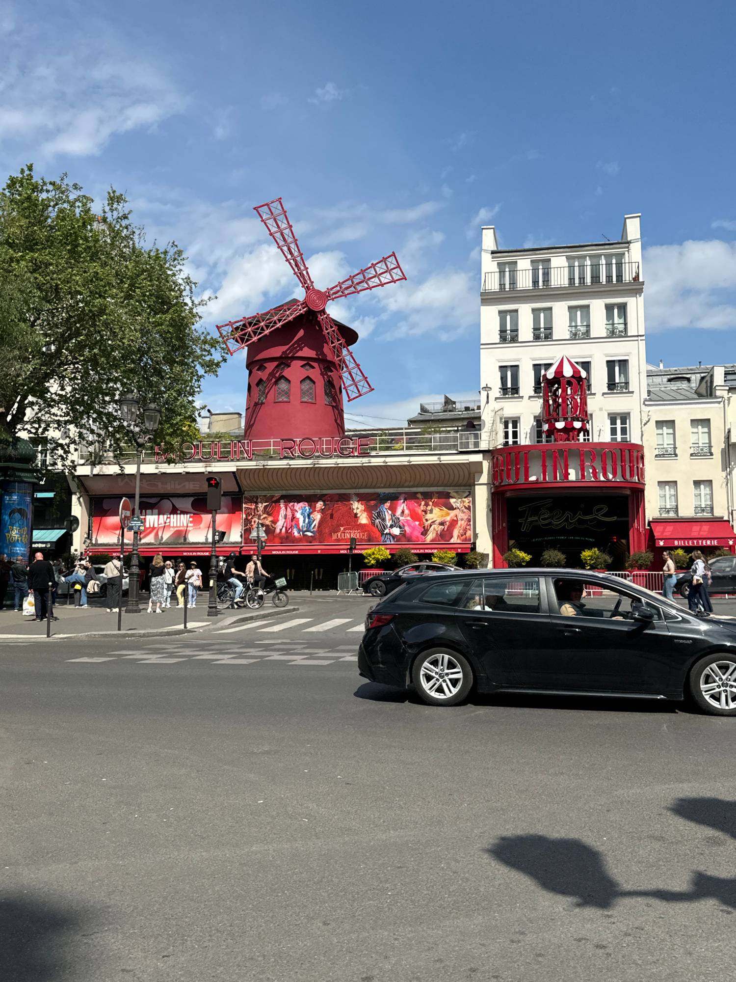 This image captures a vibrant daytime street scene in Paris, France, centered on the iconic Moulin Rouge cabaret. The prominent subject is the red Moulin Rouge building, distinguished by its large red…read more