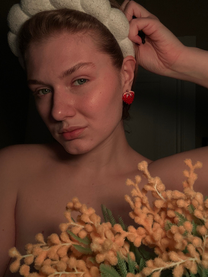 A woman with a white, puffy headband tilts her head, revealing a red strawberry-shaped earring. Her face is fair, and her eyes are green. Her hand is raised, holding a black object near her head. Her…read more