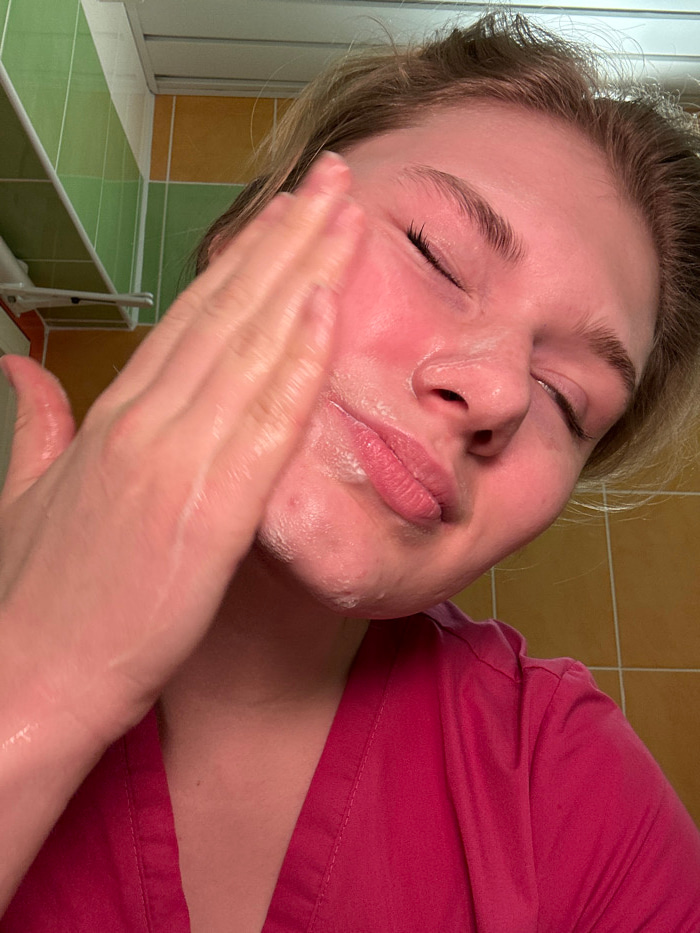 A fair-skinned person with closed eyes is applying a white, creamy substance to their face with their right hand. The person wears a pink top. The background features beige and green tiled walls and a…read more