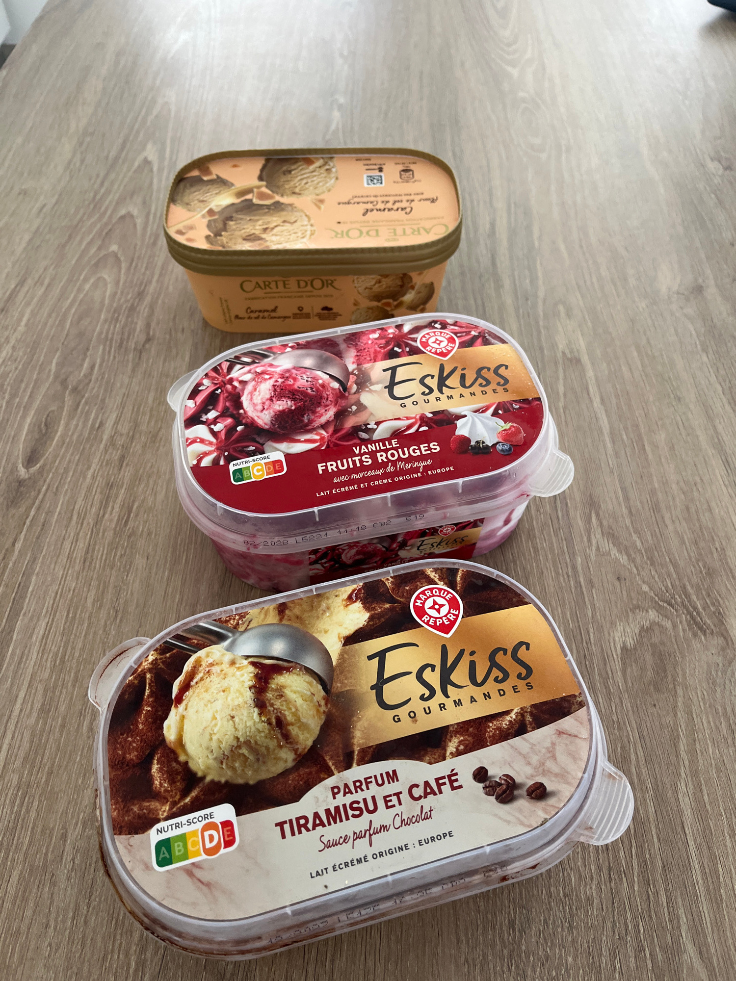 Three containers of frozen desserts are displayed on a light-colored wooden surface, likely a table or floor, in an indoor setting in Saint-Just-Saint-Rambert, France. The containers are positioned at…read more
