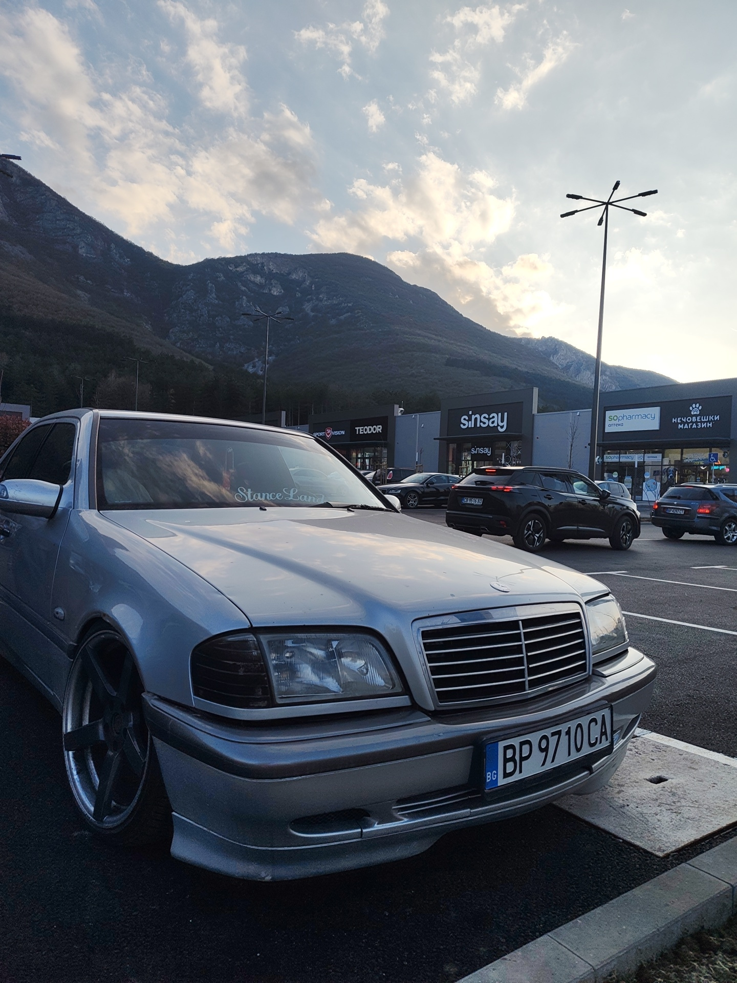The image shows a silver Mercedes-Benz car parked in front of a shopping center in Vratsa, Bulgaria, with mountains in the background. The car has a license plate that reads "BP 9710 CA". The shopping…read more