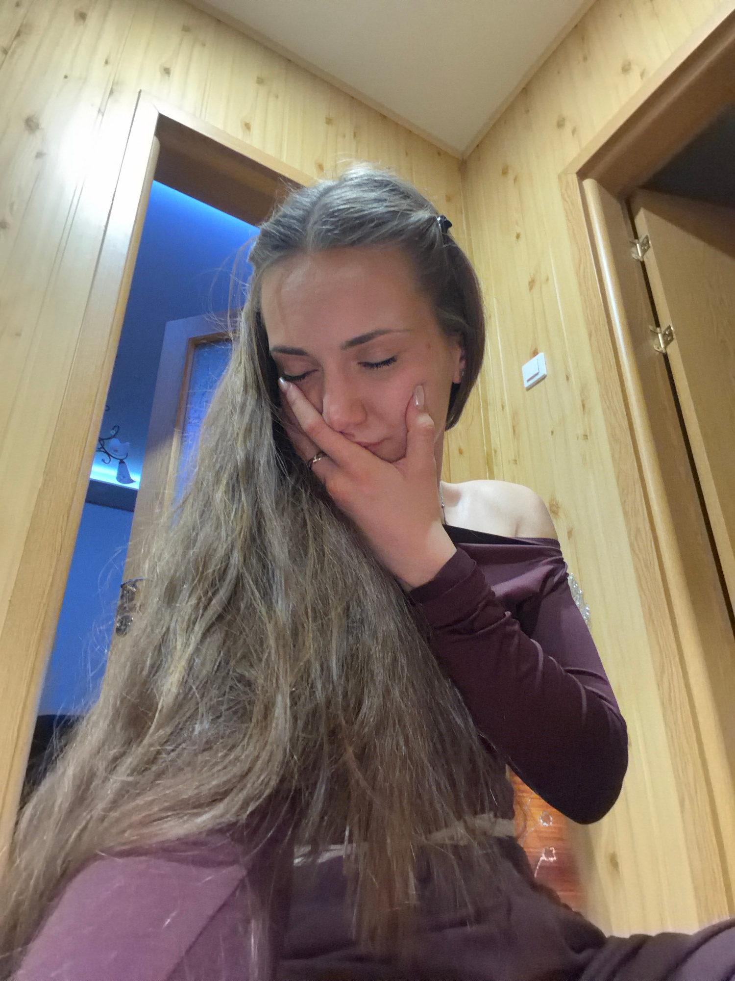 A woman with long blonde hair is posing for a photo. She is wearing a long-sleeved purple shirt and a ring on her left hand. She is holding her hand to her face. The background appears to be the inter…read more