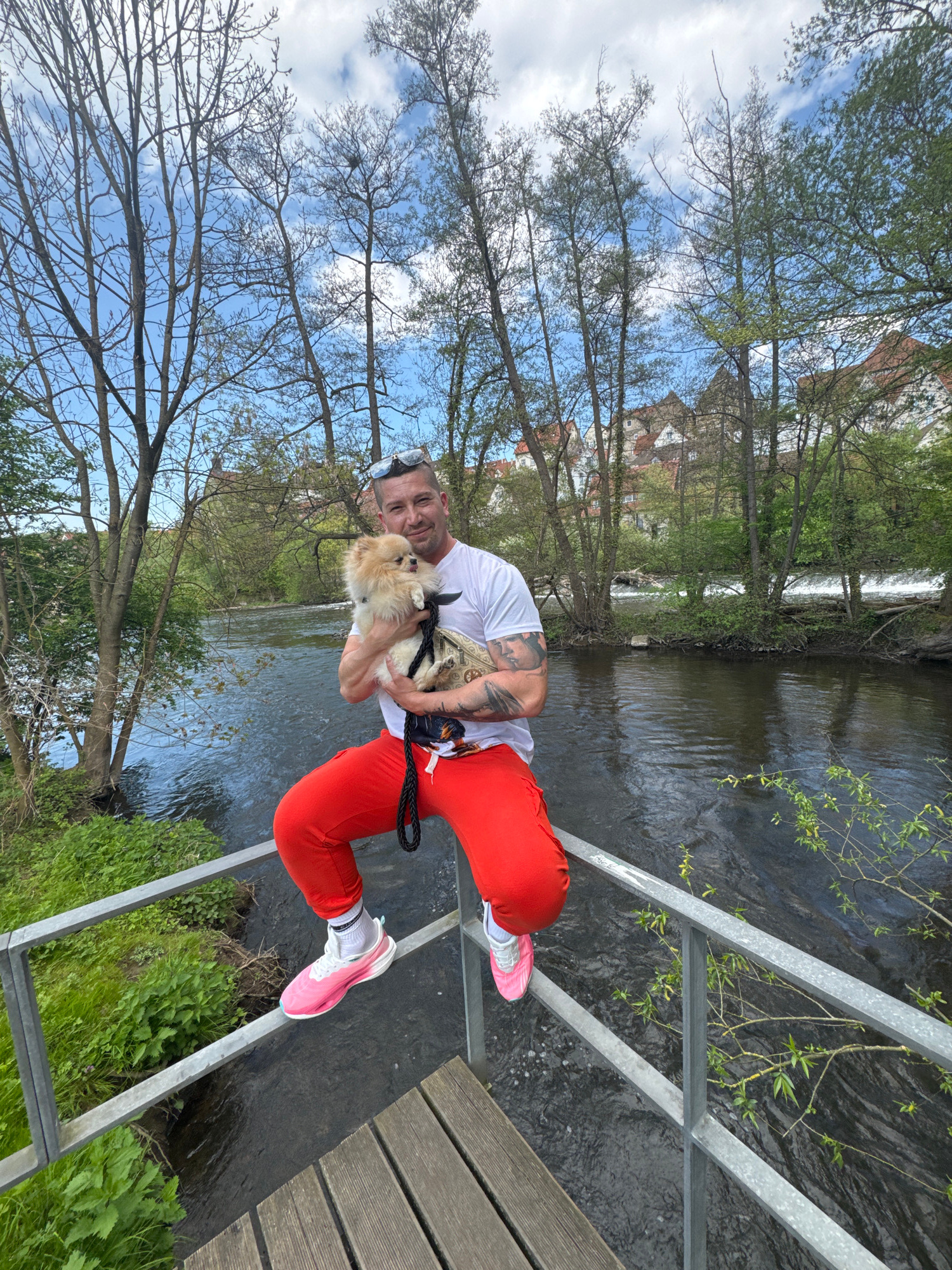 A man holds a dog while standing on a bridge over the Enz River in Besigheim, Germany. The man is wearing a white shirt, red pants, and pink-and-white shoes. He has tattoos on his arms. The dog is a sā¦read more