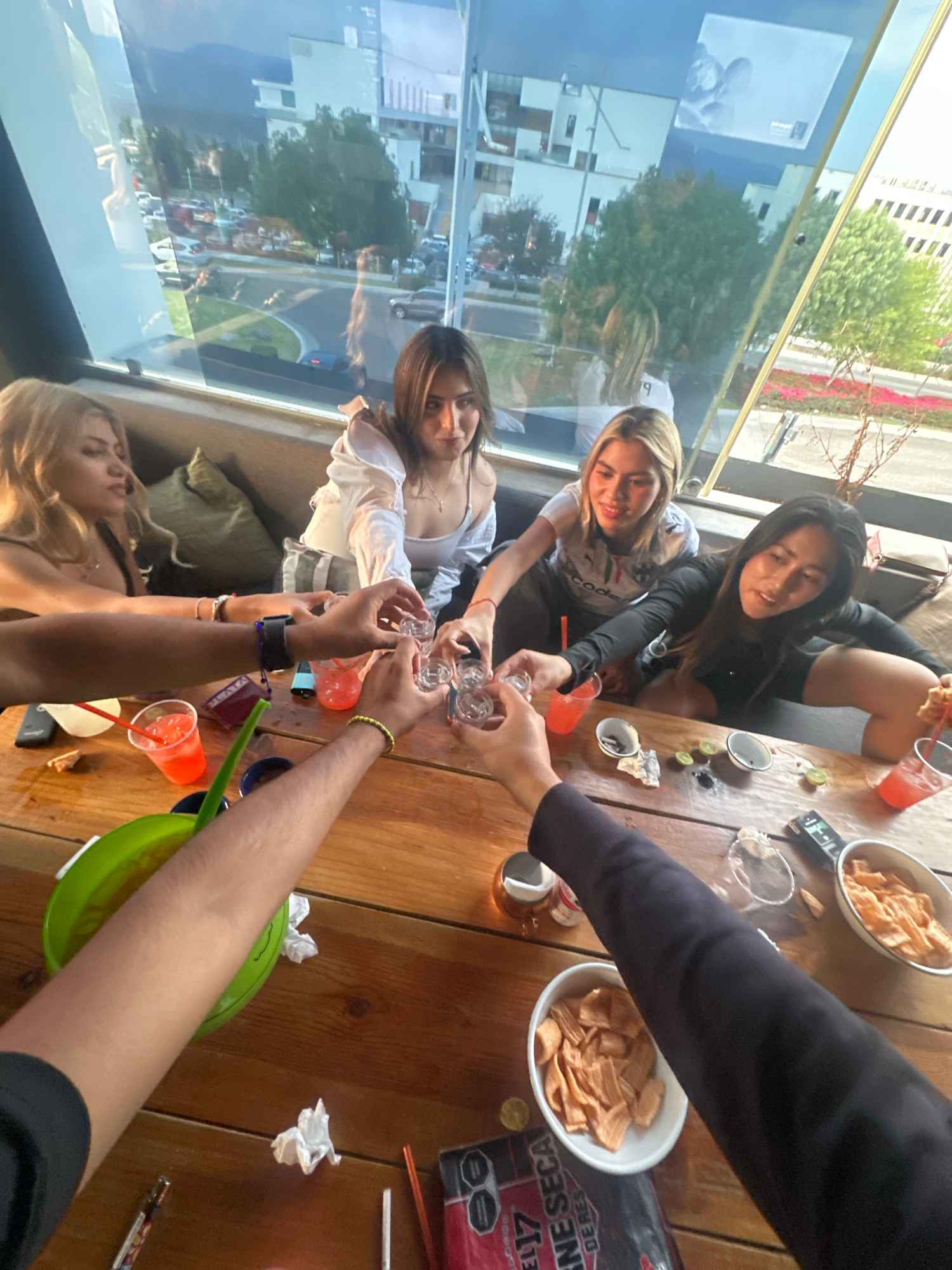 A group of five people are sitting around a wooden table, possibly in a restaurant or bar in Zibatá, Mexico. They are raising small shot glasses in a toast. There are bowls of snacks (likely chips) on…read more