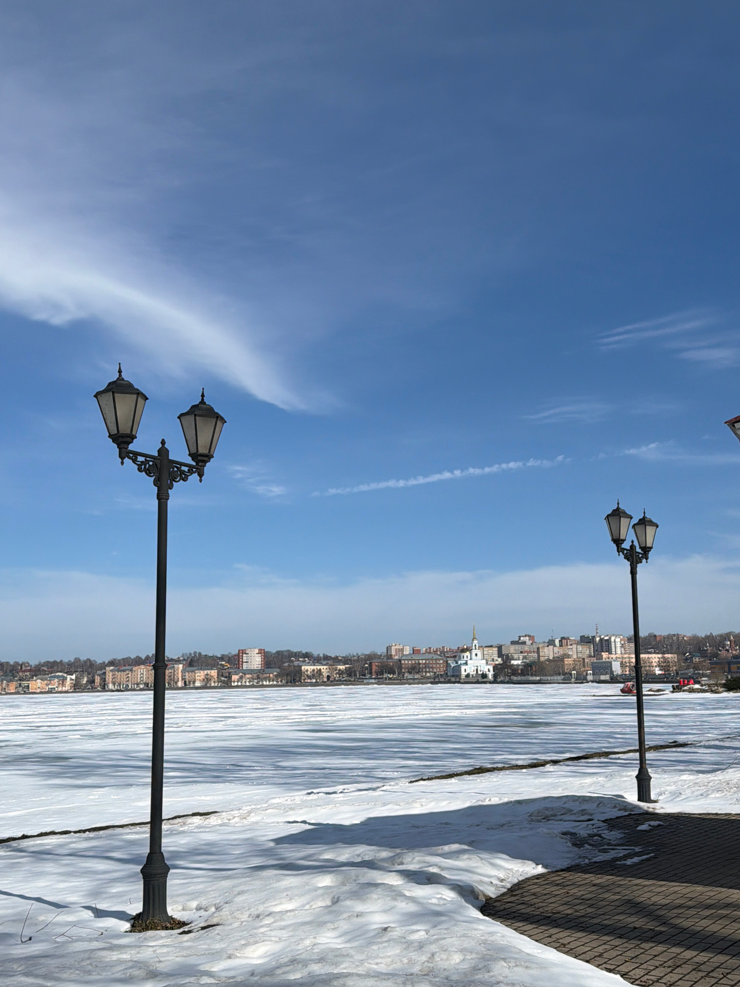 The image depicts a winter scene in Votkinsk, Russia. Two vintage lampposts stand prominently in the foreground against a bright blue sky with scattered cirrus clouds and a contrail. In the midground,…read more
