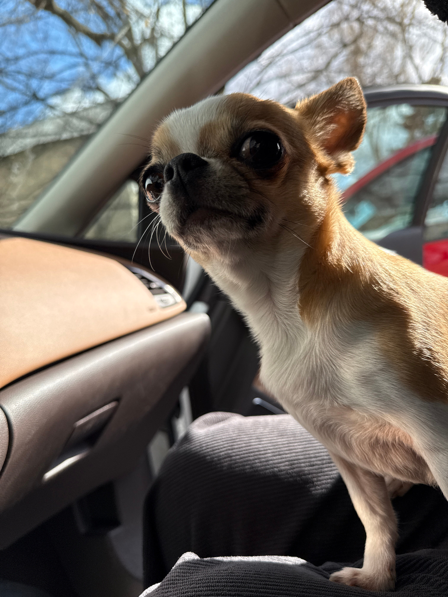 The image depicts a small, tan and white Chihuahua dog inside a car. The dog is looking upwards towards the camera with its head tilted. The interior of the car includes a beige glove compartment abov…read more