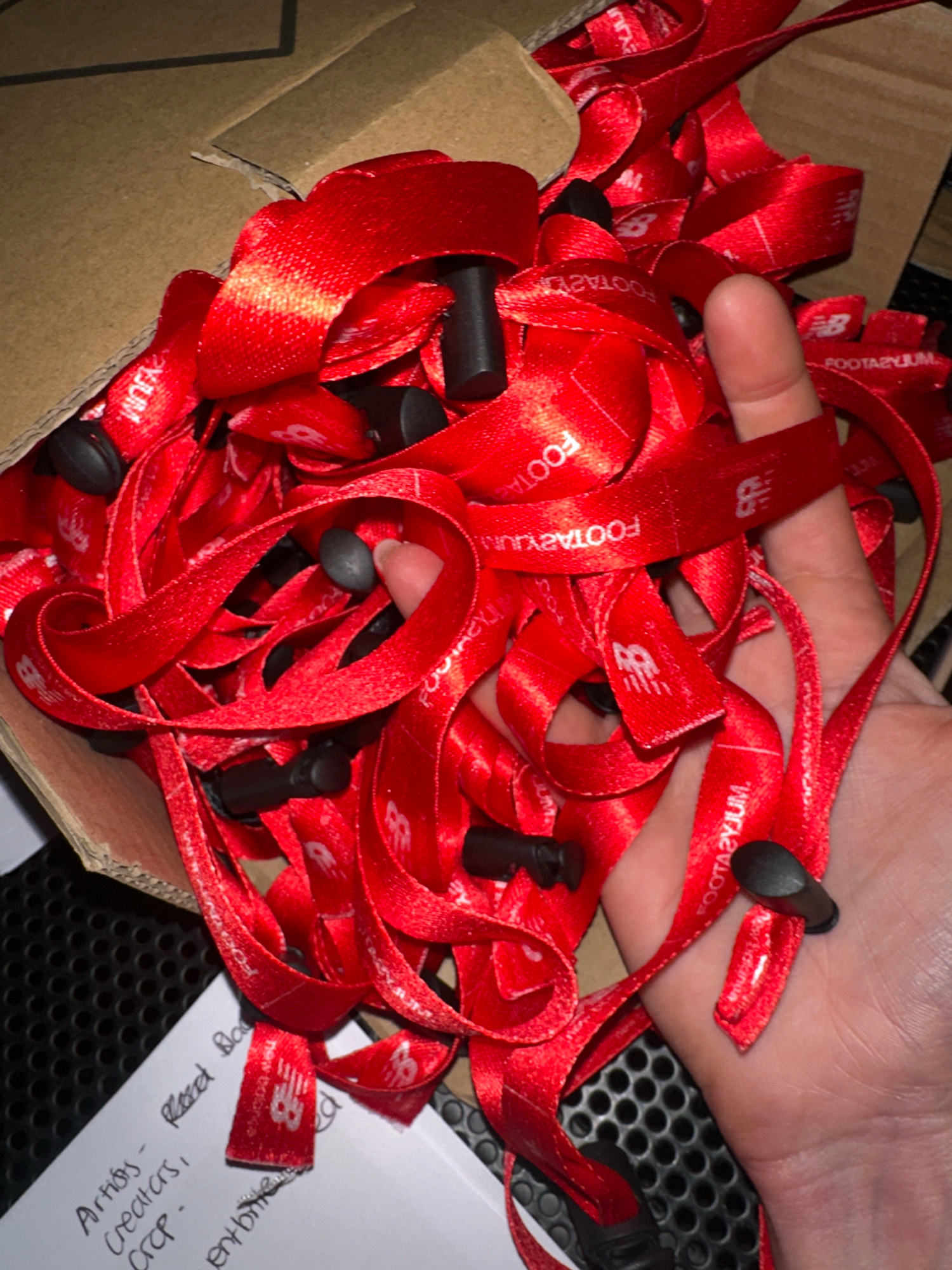 A close-up, overhead view depicts a substantial quantity of red lanyards, predominantly contained within a plain brown cardboard box. Each lanyard is emblazoned with the "FOOTASYLUM" text and the "New…read more