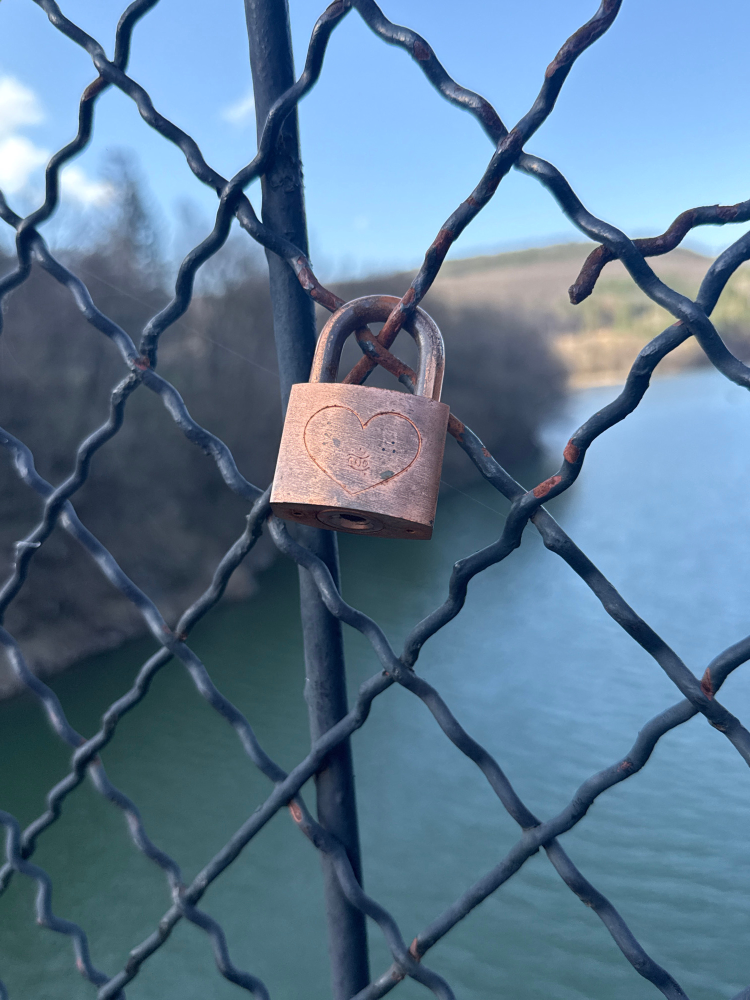 A close-up, eye-level shot shows a copper-colored padlock attached to a rusted metal wire fence. The padlock features an engraved heart design. Behind the fence, out of focus, is a body of water and g…read more