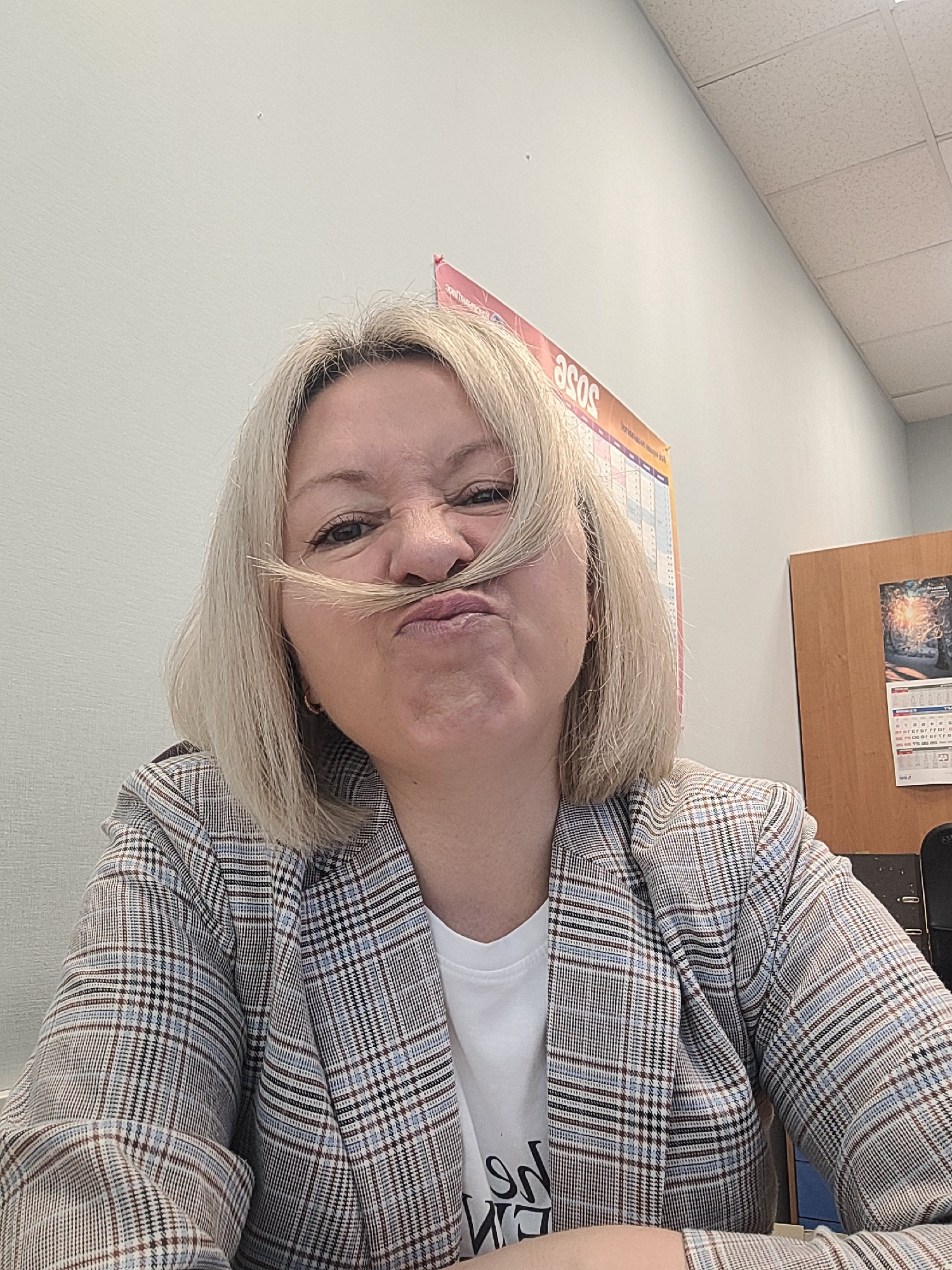 A woman with blonde hair is indoors, likely in an office, making a funny face. She has a strand of her hair arranged to resemble a mustache above her lip. She is wearing a white t-shirt and a plaid bl…read more