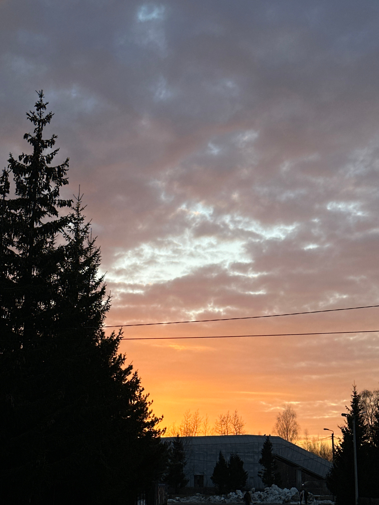 The photograph depicts a sky with varied cloud cover, transitioning from grey and diffuse on the left to a vibrant orange on the right, indicative of sunrise or sunset. Silhouetted against the sky are…read more