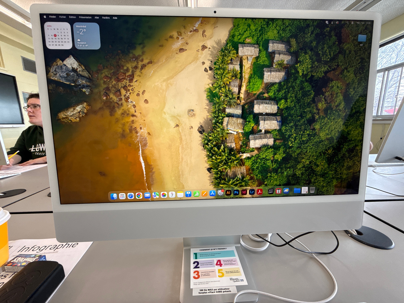 The image shows a white iMac computer displaying a desktop background of a beach with huts surrounded by trees, viewed from above. The computer screen also displays a calendar and weather widget showi…read more