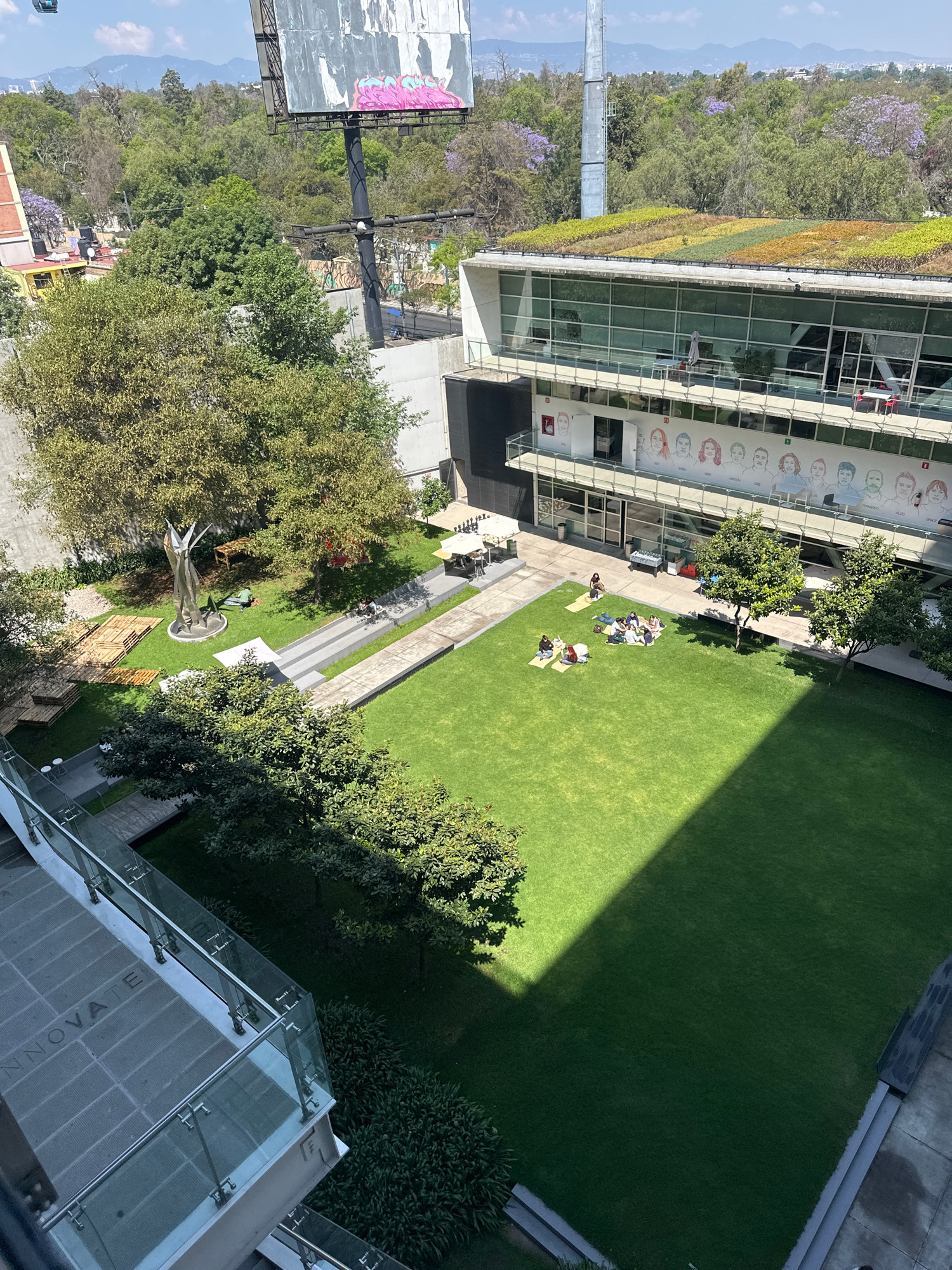 The image captures an elevated view of a lush, green urban landscape within Mexico City, Mexico. A building with a green roof and a wall adorned with caricatures flanks the upper left. Adjacent to the…read more