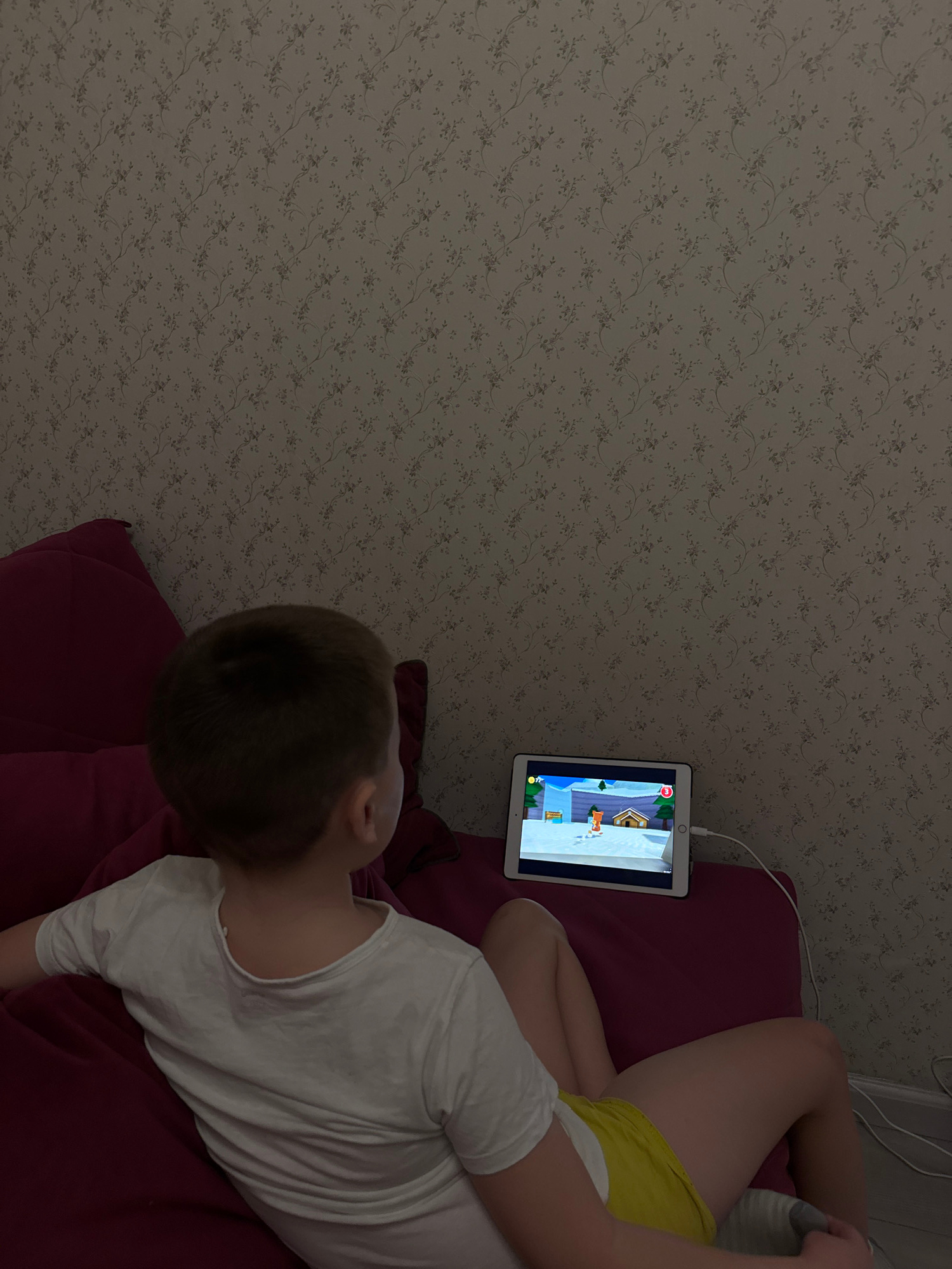 An indoor scene depicts a child engrossed in playing a game on a tablet. The child, likely a boy, is seen from the back and side, lying comfortably on a dark red or maroon cushion or bedding. He has sā¦read more