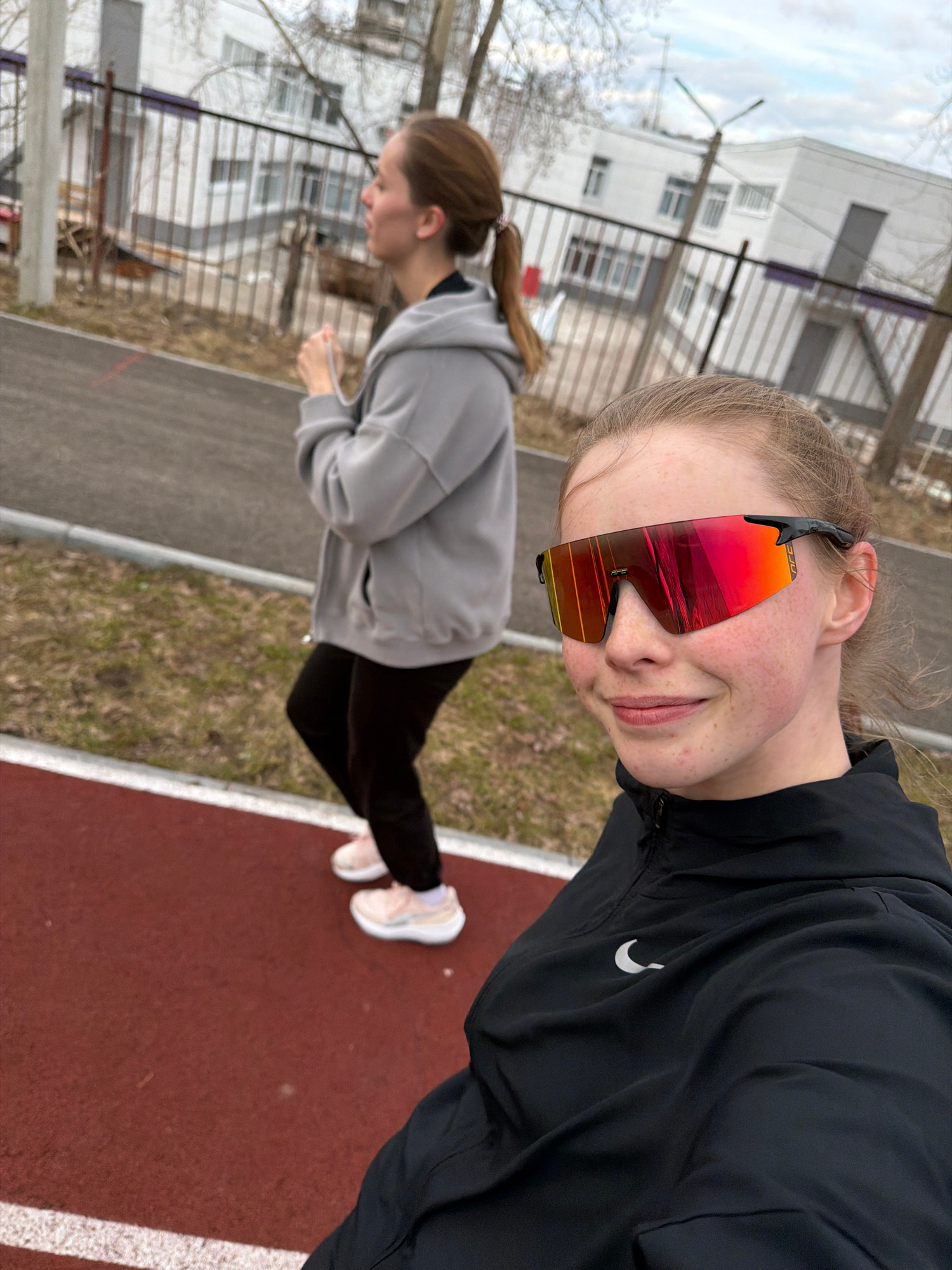 Two young women are captured in a selfie-style photograph on an outdoor athletic track, likely in Berezniki, Russia, during what appears to be a cool, overcast day in late winter or early spring. The…read more