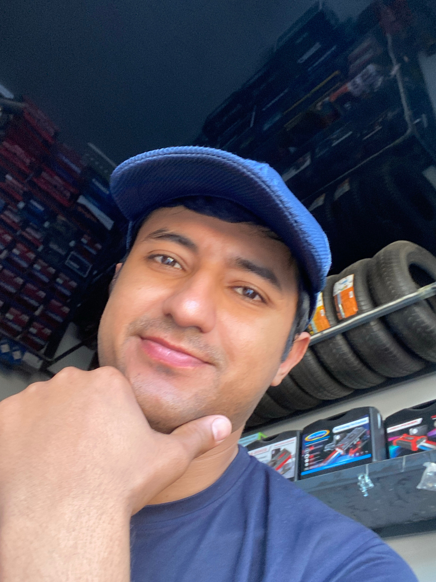 The image shows a selfie of a man wearing a blue newsboy cap and a dark blue t-shirt. He is holding his hand up to his chin, appearing to be posing. Behind him are stacked tires and boxes of what appe…read more