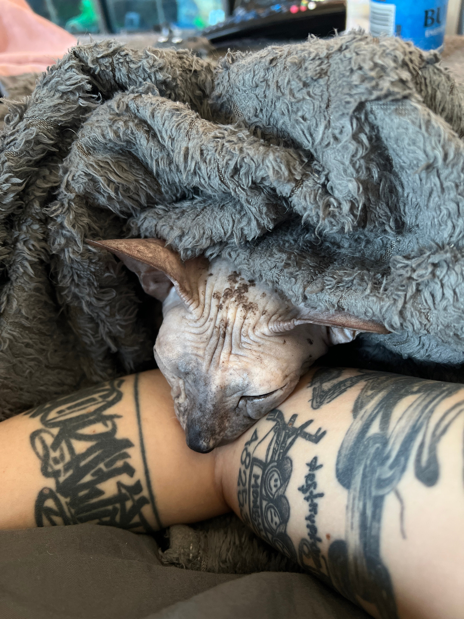 A hairless cat, identified as a Sphynx, is depicted resting on a human arm, partially covered by a thick, grey, textured blanket. The cat's head is visible, with closed eyes, wrinkled skin, and prominβ¦read more