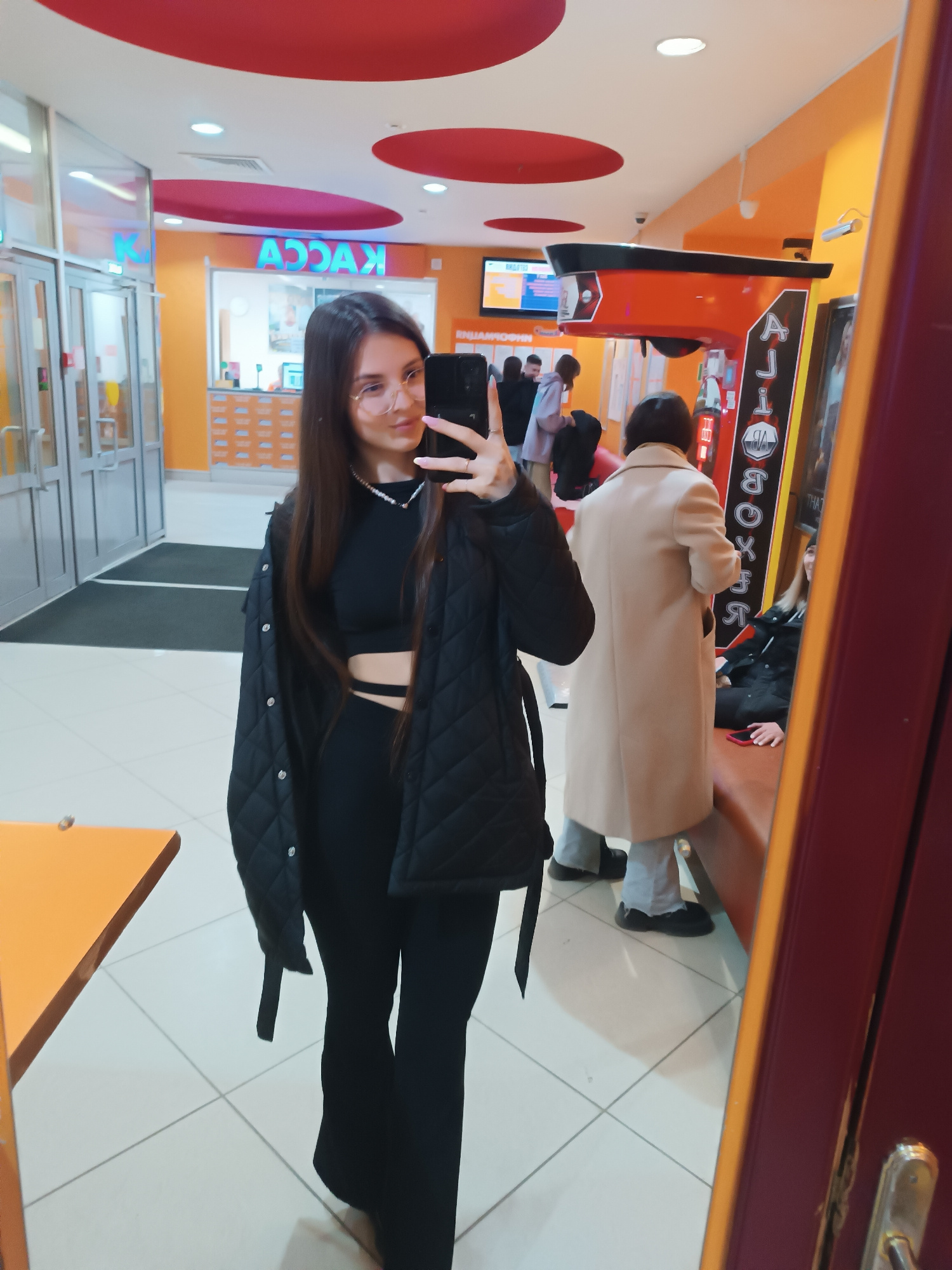 A young woman is taking a selfie in what appears to be a public indoor space, possibly a shopping mall or entertainment center. She is wearing black clothing including a top, pants, and a quilted jacket. The environment has an orange and red color scheme with tiled floors. In the background, there are other people, a seating area, and what looks like a boxing game machine. There is a sign with the word "KASSA" on it, likely indicating a ticket or payment area. The location is in an urban area, in the city of Unknown, Unknown. | Open Wire