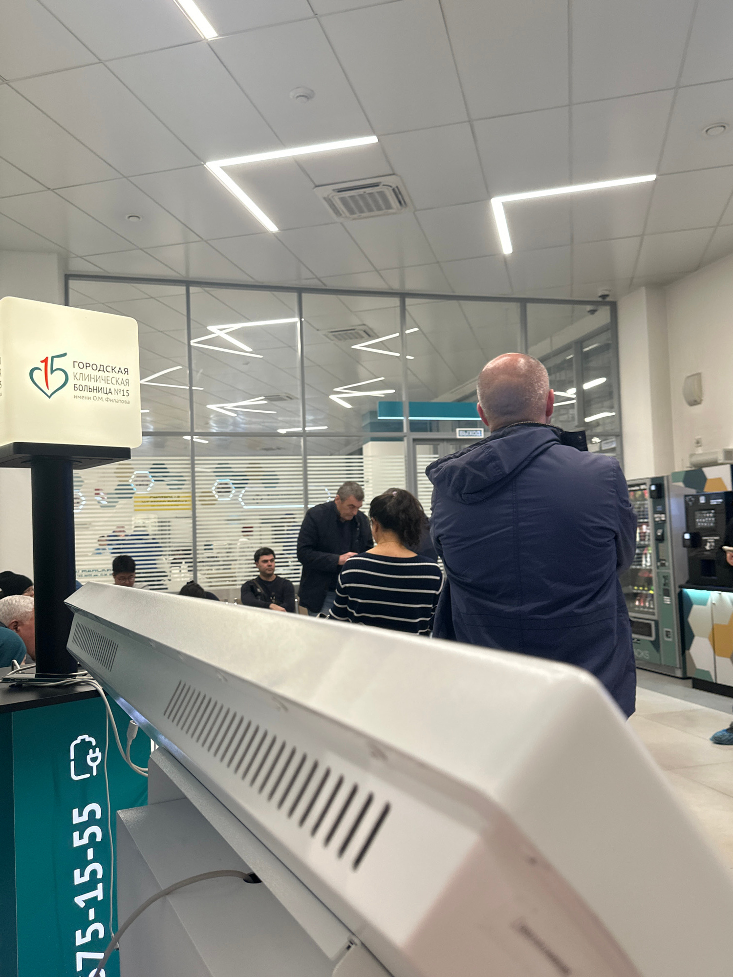 The image shows an interior shot in what appears to be a medical facility or clinic in Moscow, Russia. Several people are present, including individuals in a queue. The environment is a modern, well-…read more