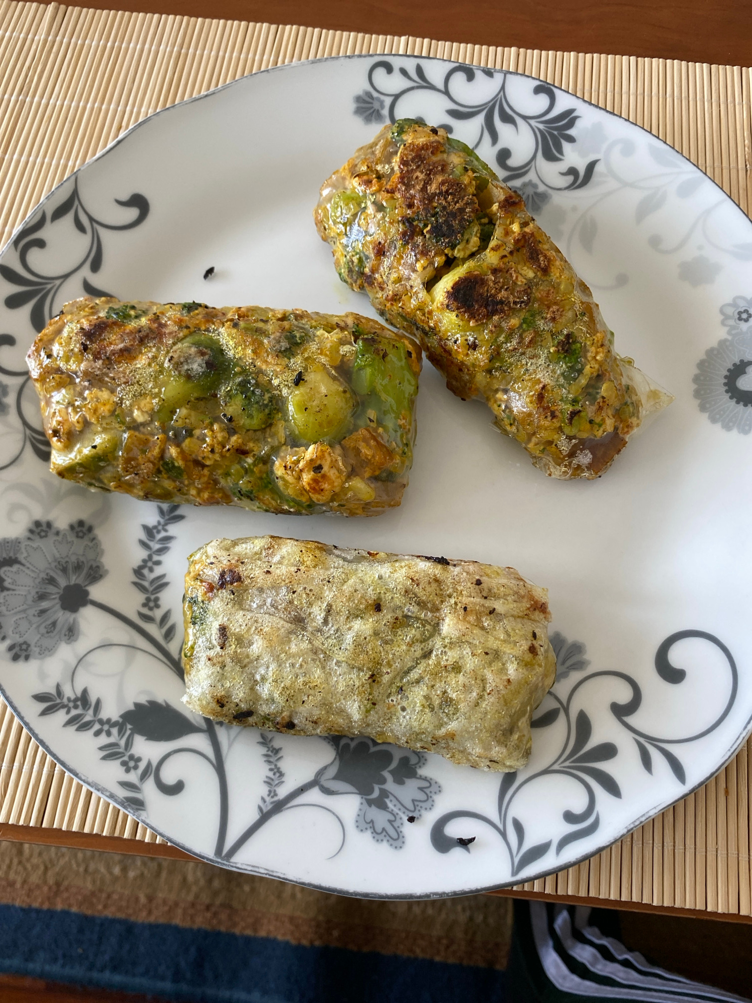 This image captures a close-up, overhead view of three rectangular food items served on a white plate with a decorative grey floral pattern. The food items resemble spring rolls or summer rolls, each…read more