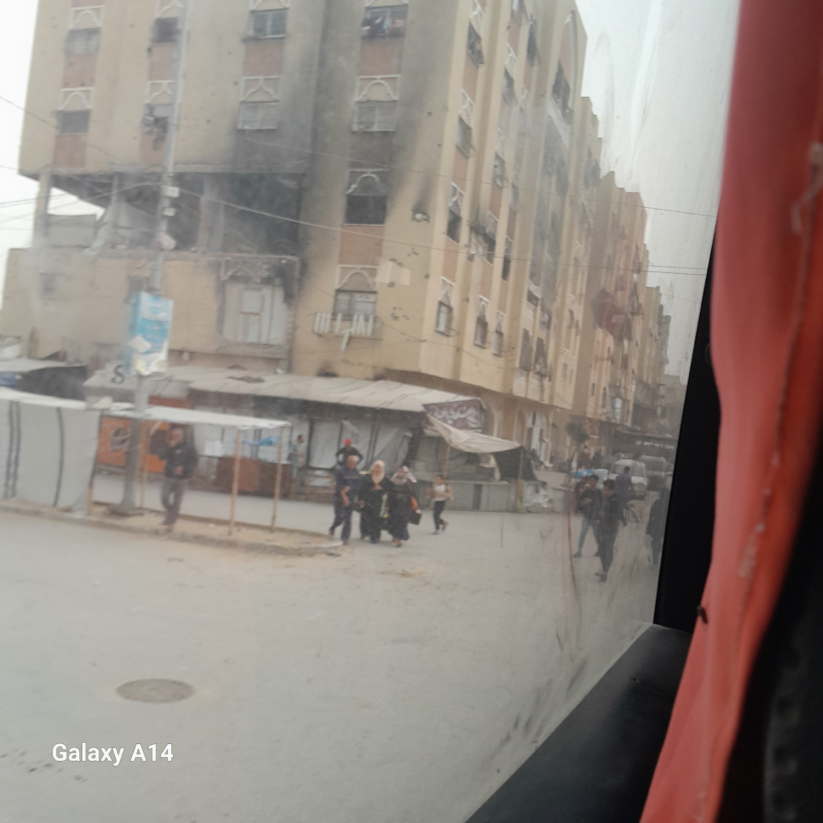 The image shows a war-torn building in the city of Khan Yunis, Palestinian Territory. The building is a multi-story apartment complex that has been damaged by explosions and gunfire. Many windows are…read more