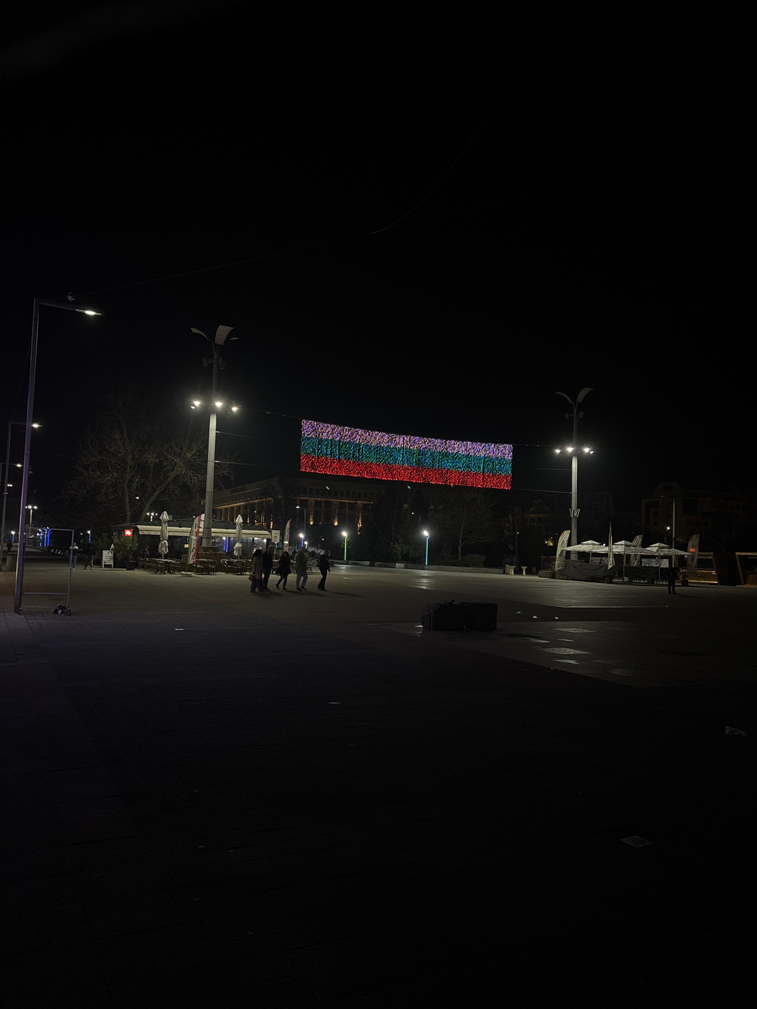 The image shows a nighttime scene on a paved area in Burgas, Bulgaria. A horizontal display of red, green, and white lights, reminiscent of the Bulgarian flag, is suspended overhead. Pedestrians are w…read more