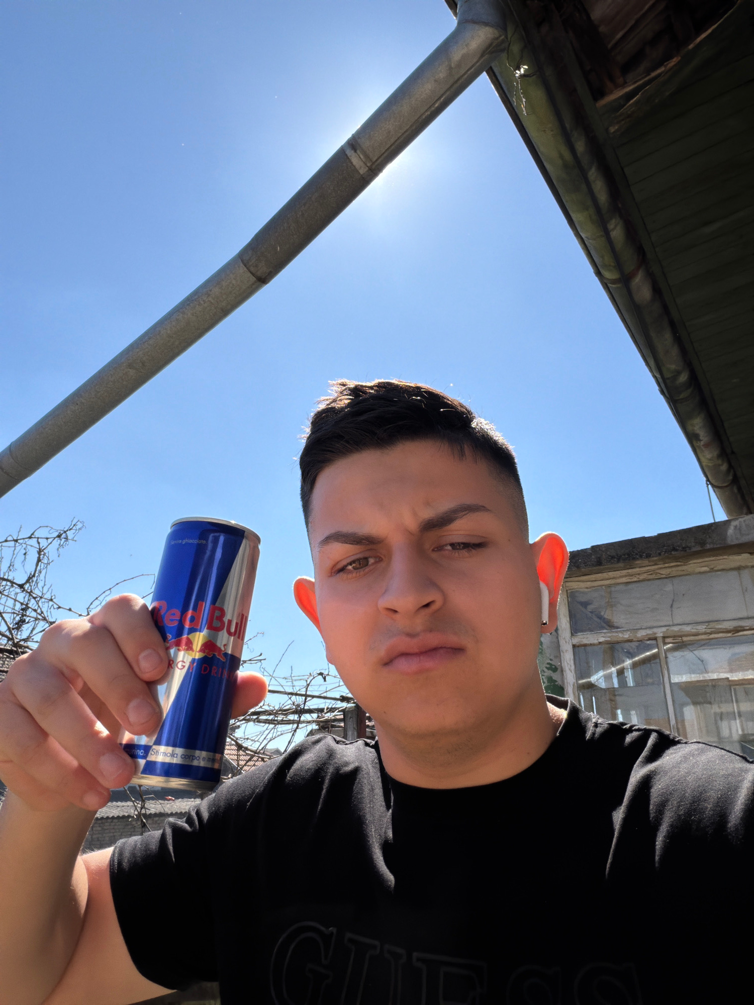 A low-angle shot captures a man holding a Red Bull energy drink can against a bright blue sky. The man is fair-skinned with short, dark hair and is wearing a black t-shirt. A white wireless earbud is…read more