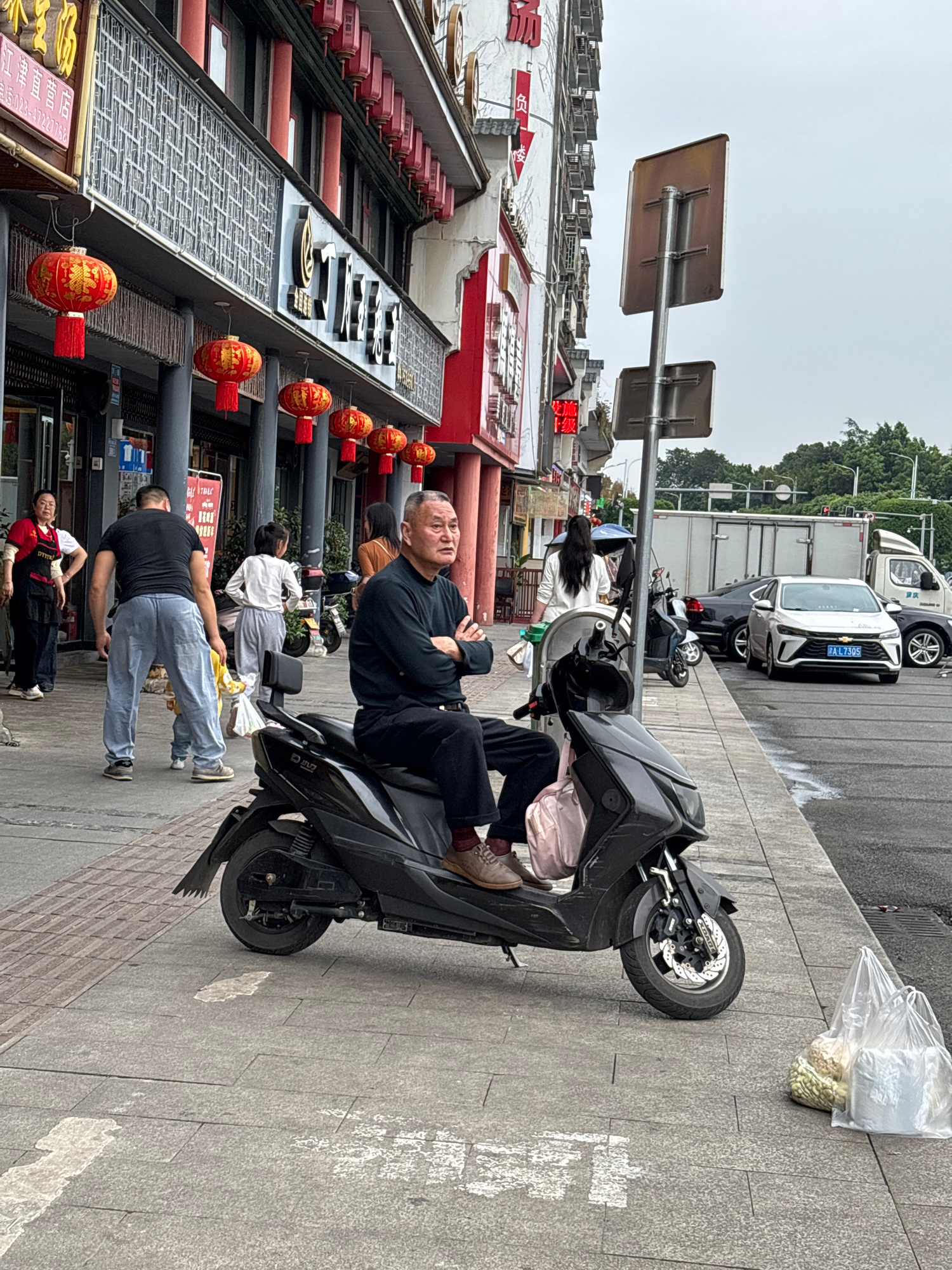 The scene depicts a sidewalk in Jiangjin, China, in front of a traditional-style building adorned with red lanterns. On the sidewalk, a man in a black shirt and black pants reclines on a black scooter…read more