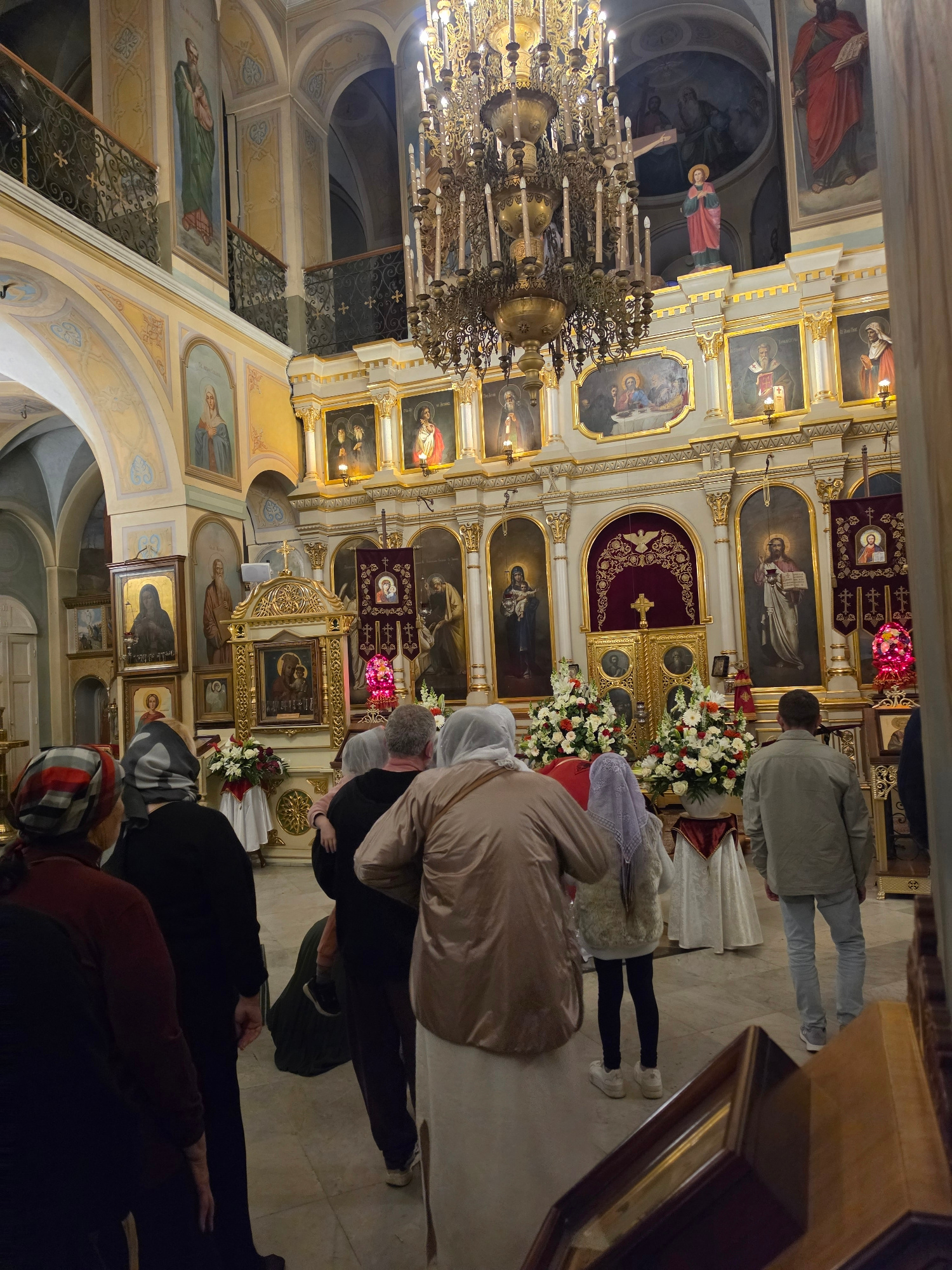 A group of people are inside a decorated Orthodox church. The walls are adorned with religious icons and paintings in golden frames. A large, ornate chandelier hangs from the ceiling. Some people are…read more