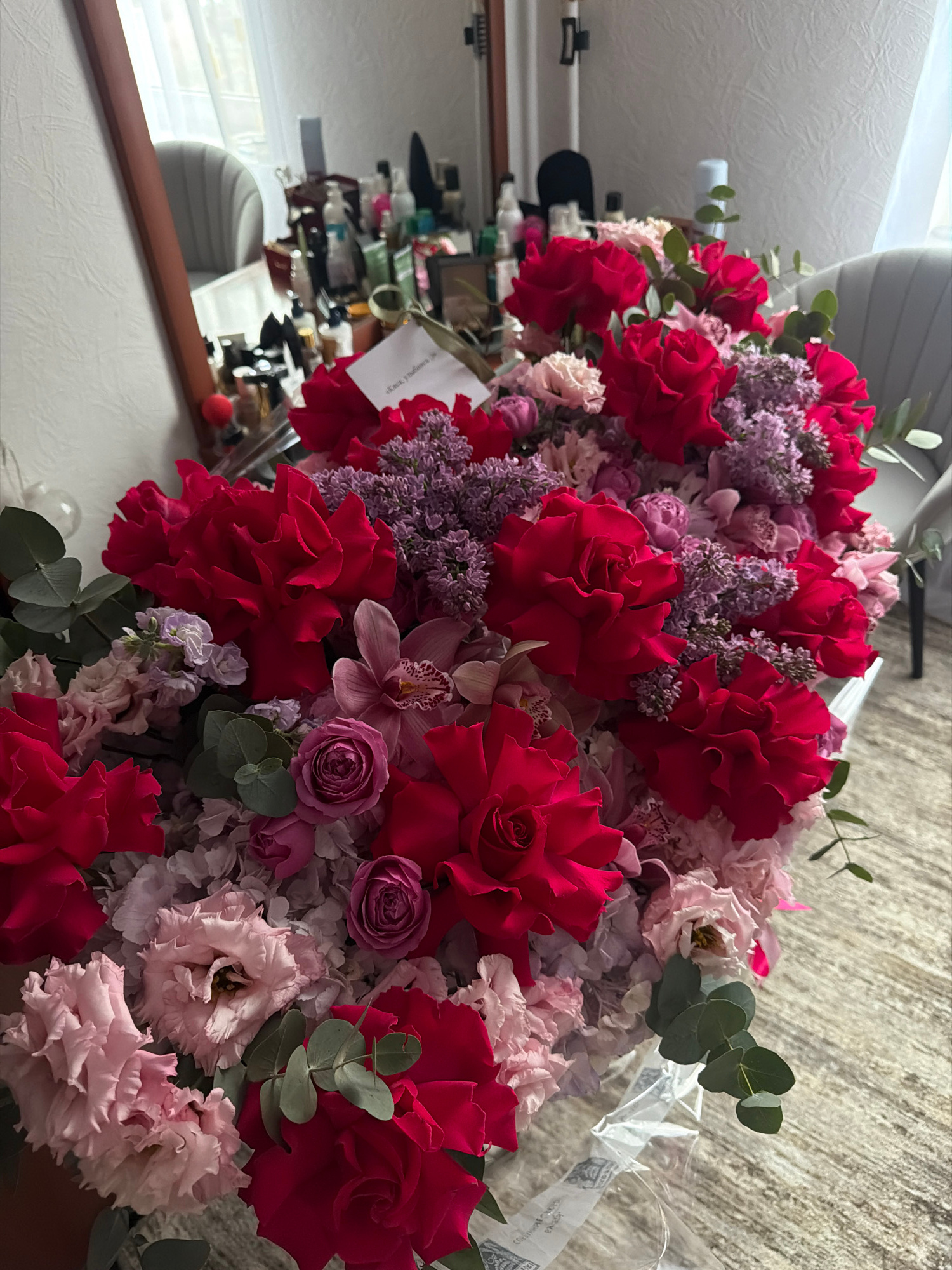 A close-up shot depicts a bouquet of flowers arranged on a surface, likely indoors. The bouquet features a variety of flowers, including red roses, light pink carnations, purple lilacs, and other smal…read more
