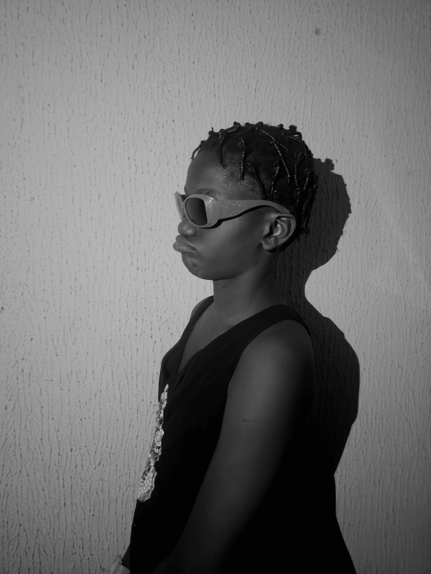 A black and white medium shot depicts a person in an Asaba, Nigeria swimming pool. The person lies on their side at the edge of the pool. The person is wearing goggles and a dark bathing suit. The per…read more