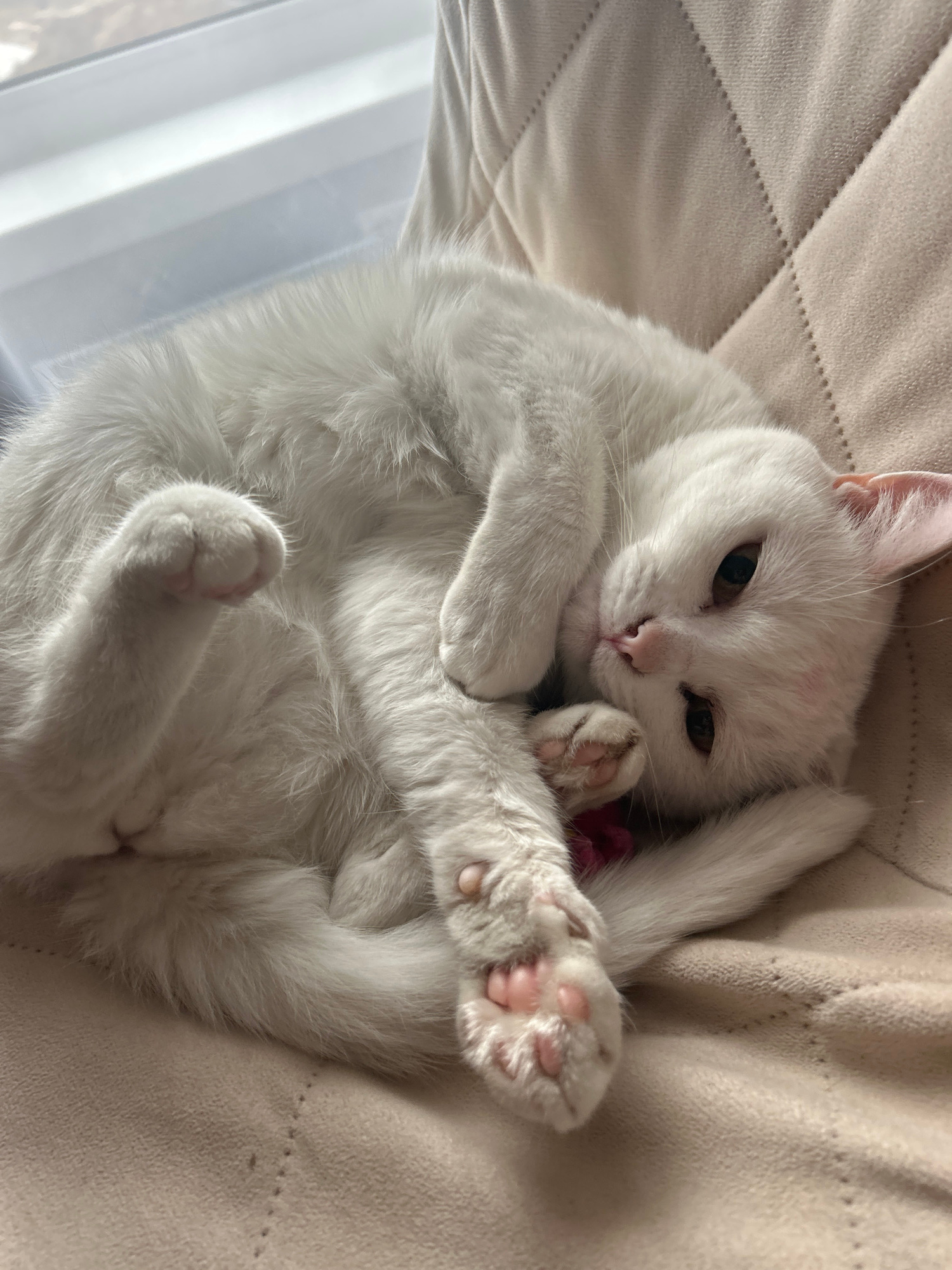 A domestic, white cat is curled up on a beige, quilted cushion. The cat's paws are visible, revealing pink toe pads. The cat's head is turned towards the camera with brown eyes. There is a small red m…read more