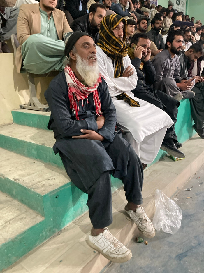 The scene depicts approximately two dozen men seated on tiered concrete spectator steps within an indoor or semi-enclosed venue in Quetta City Tehsil, Pakistan. The concrete steps feature light green…read more