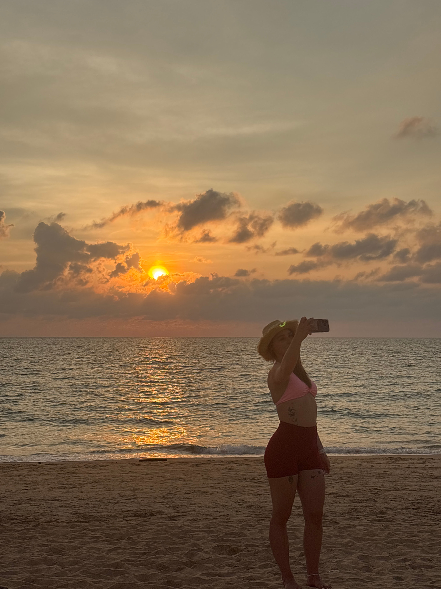 A woman stands on a beach at sunset in Tambon Mai Khao, Thailand. She wears a pink bikini top and red shorts and holds a smartphone up, presumably taking a picture of the sunset. The sun is visible th…read more