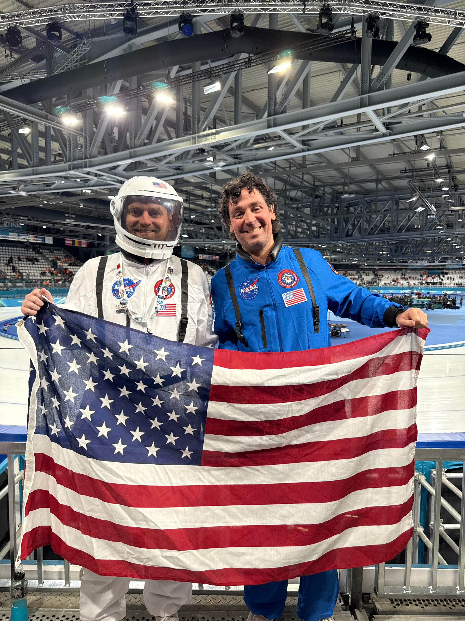 Two men, dressed in space-themed attire, are posing for a photograph while holding American flags indoors. The image is vertically oriented. On the left, a man with dark, curly hair is smiling broadl…read more