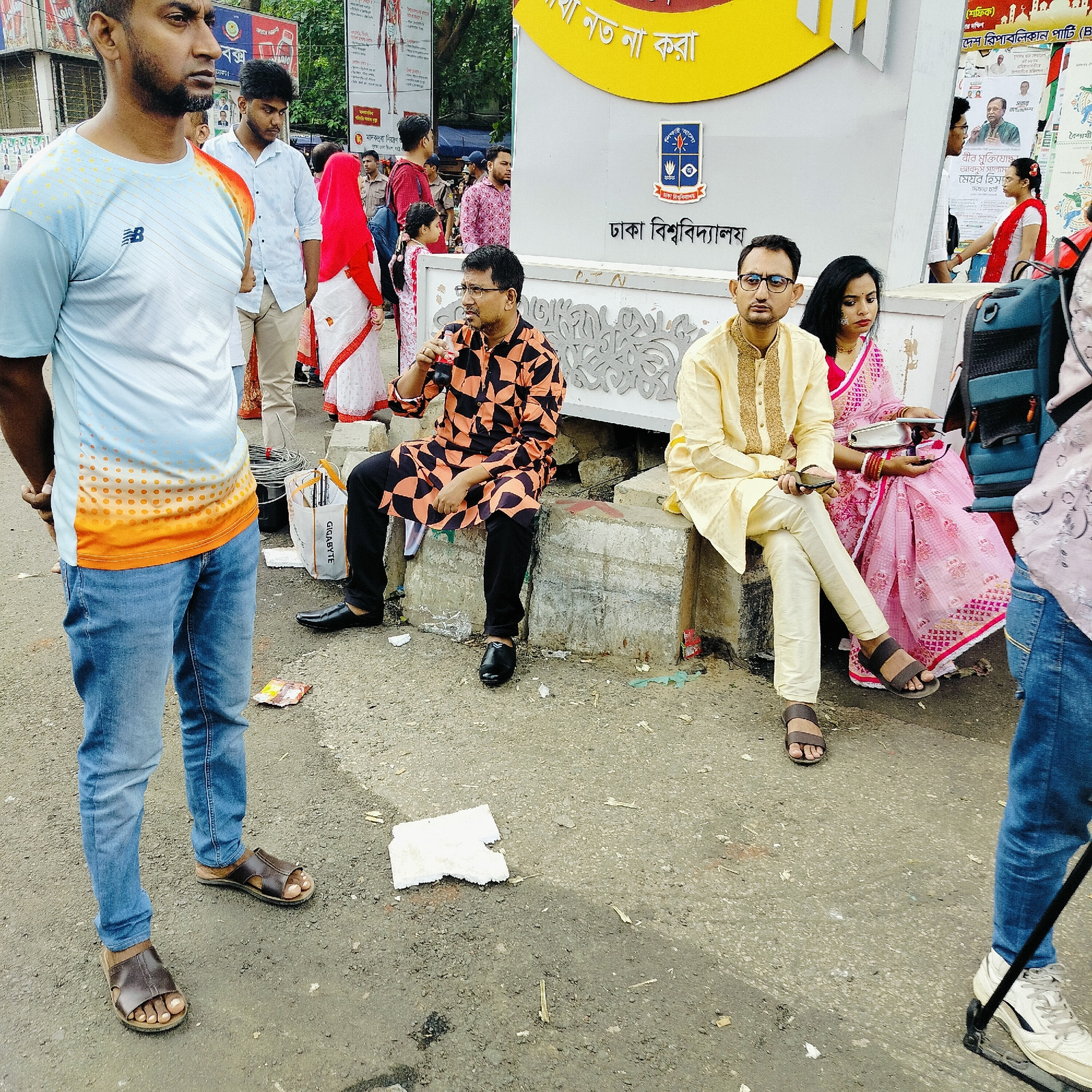 Here is a detailed description of the image: **Setting:** The photograph is taken outdoors, likely on a street in Dhaka, Bangladesh. This is based on the background signage indicating "Dhaka Universi…read more