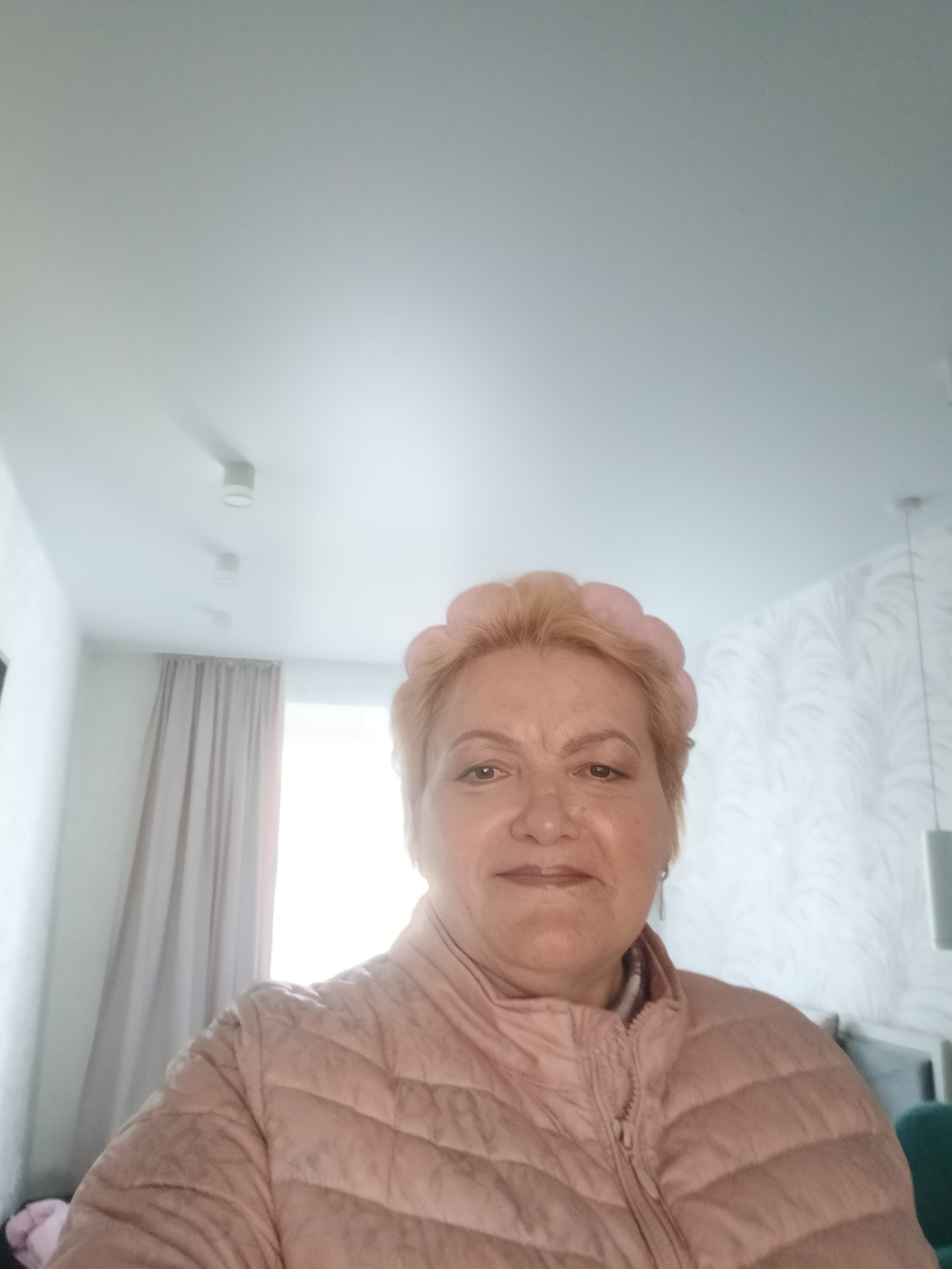 A fair-skinned woman with short blonde hair and a pink padded jacket is facing the camera. She has a pink hair accessory. The setting appears to be an interior space. To the left, a window with beige…read more