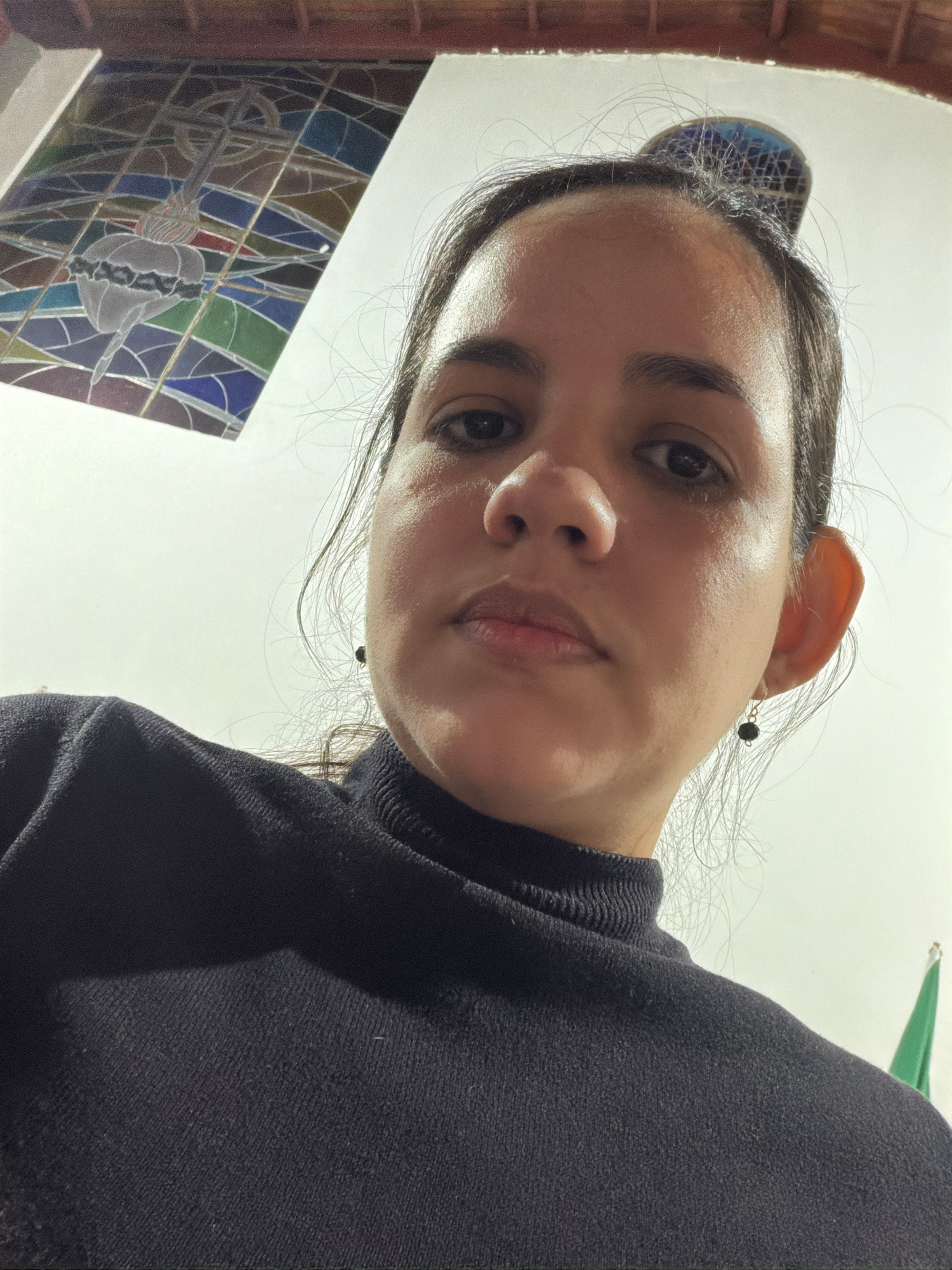An adult female subject is depicted in a low-angle, head-and-shoulders portrait, consistent with a selfie, taken indoors in Guayana City, Venezuela. The subject has dark hair pulled back, with minor w…read more