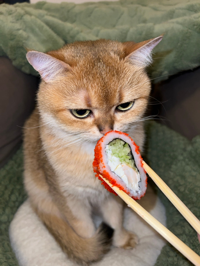 A golden cat lies on a green blanket, its head turned towards the camera. Chopsticks hold a piece of sushi close to the cat's nose. The sushi roll is filled with cucumber, cream cheese, and shrimp, anβ¦read more