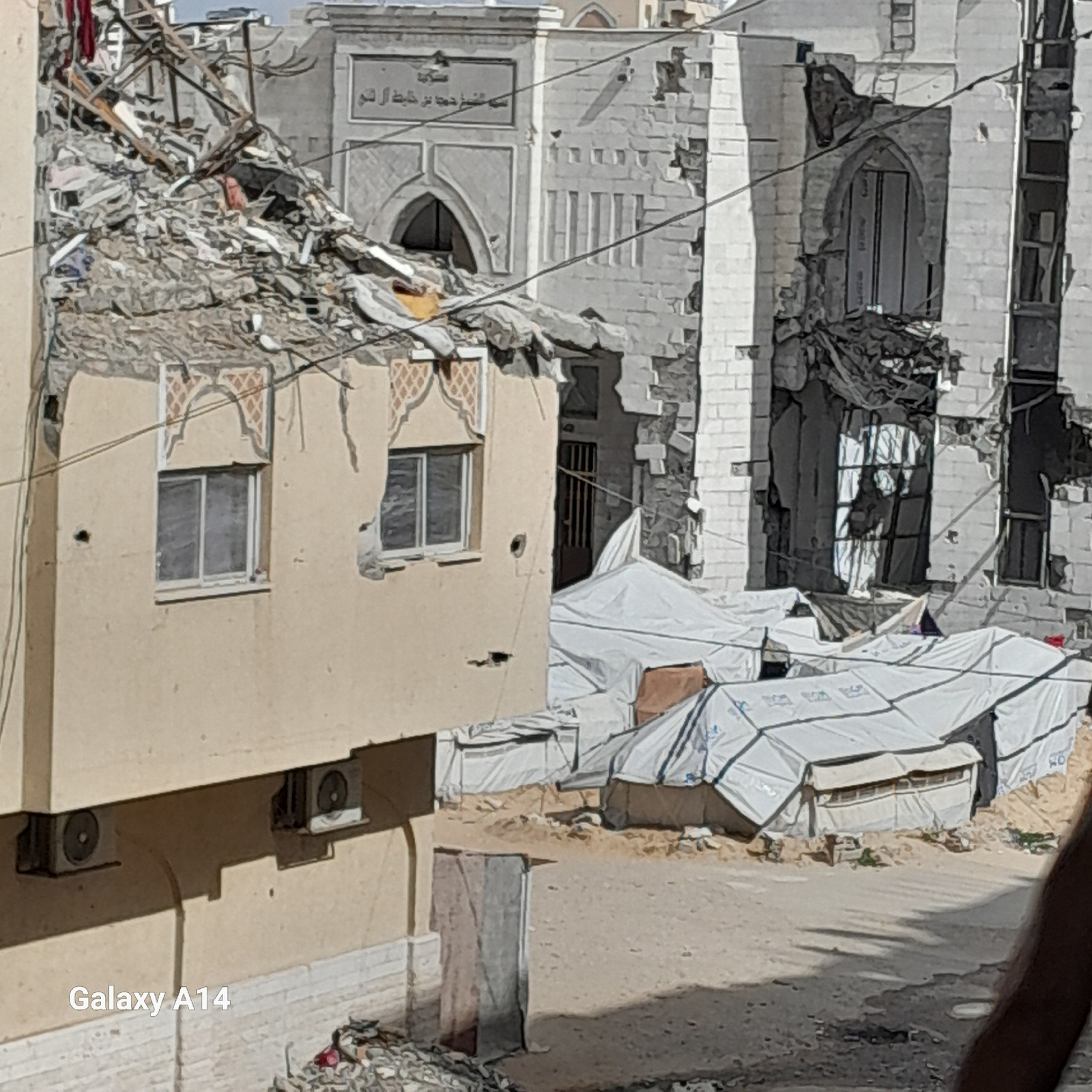 The image shows building damage in Khan Yunis, Palestinian Territory. A multi-story building shows significant structural damage, with rubble and debris visible. Next to it, a lighter colored building…read more