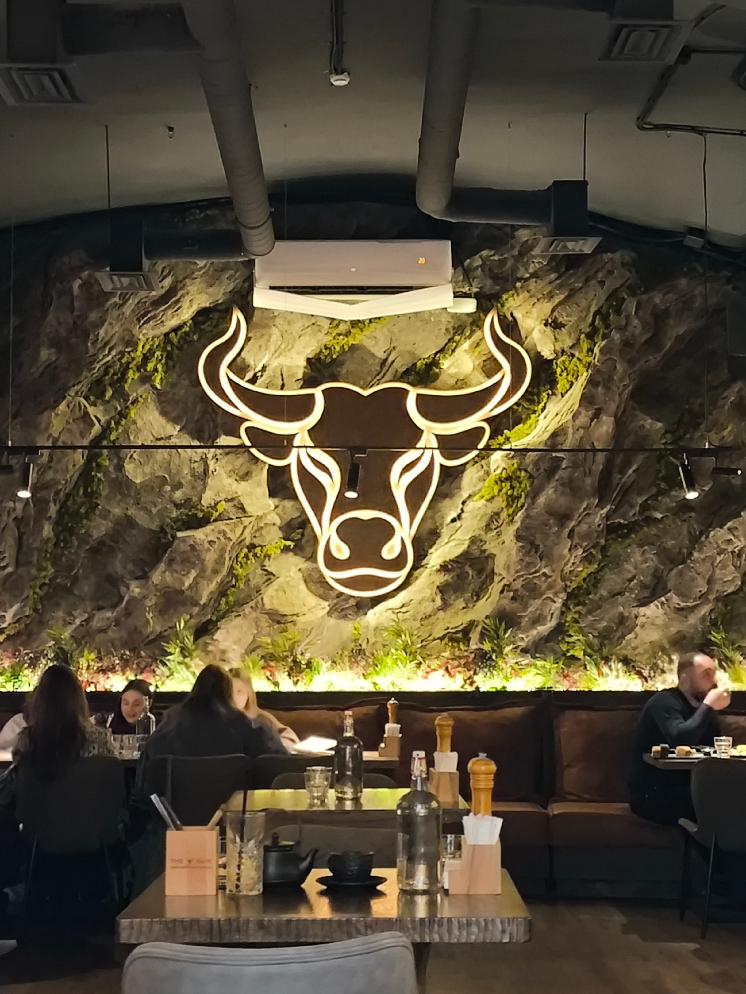 The image shows the interior of a restaurant in Unknown, Unknown. The focal point is a large, illuminated bull head logo mounted on a wall designed to resemble a rock face with moss and vegetation. Th…read more