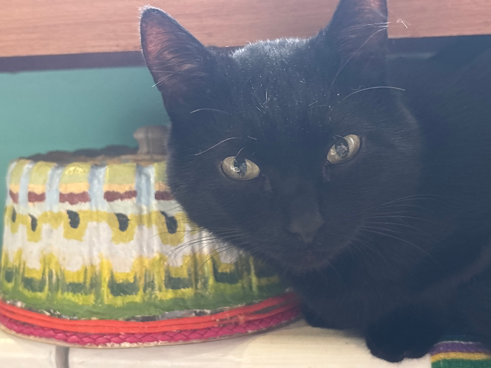 A close-up shot shows a black cat sitting or lying next to a cylindrical container decorated with a colorful pattern. The cat is facing forward, with its ears perked up and its green eyes visible. The…read more
