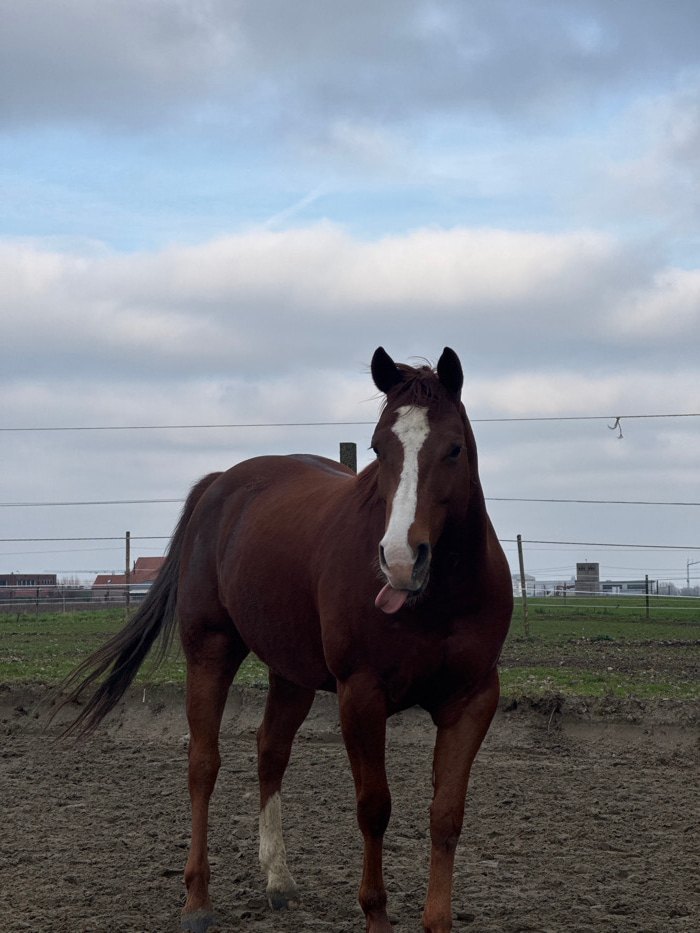 The scene depicts a bay horse standing in a muddy paddock in Estaimpuis, Belgium, under an overcast sky with visible patches of blue. The horse, centered in the frame, faces forward with its head slig…read more