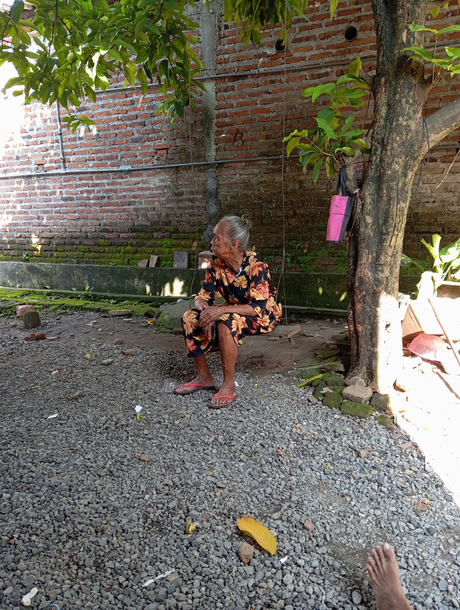 An elderly woman sits on the ground in Baron, Indonesia. She is wearing a dark dress with floral patterns and red sandals. She is seated between a weathered brick wall and a gravelly surface. A thick…read more