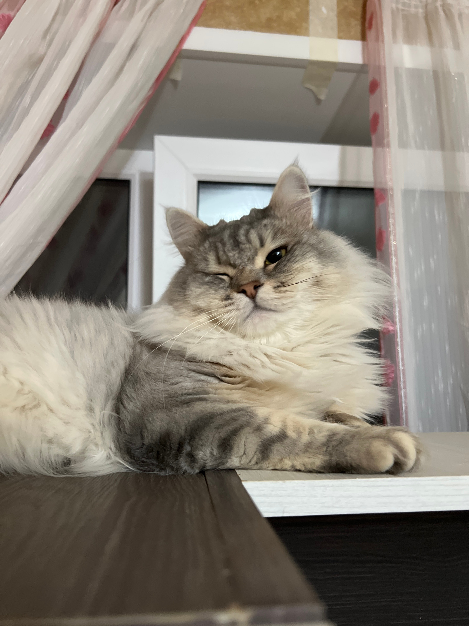 A fluffy, grey and white cat is positioned upside down, clinging to a white cabinet or shelf edge with its paw. The cat's face is tilted, and it looks towards the camera with one eye partially closed.…read more
