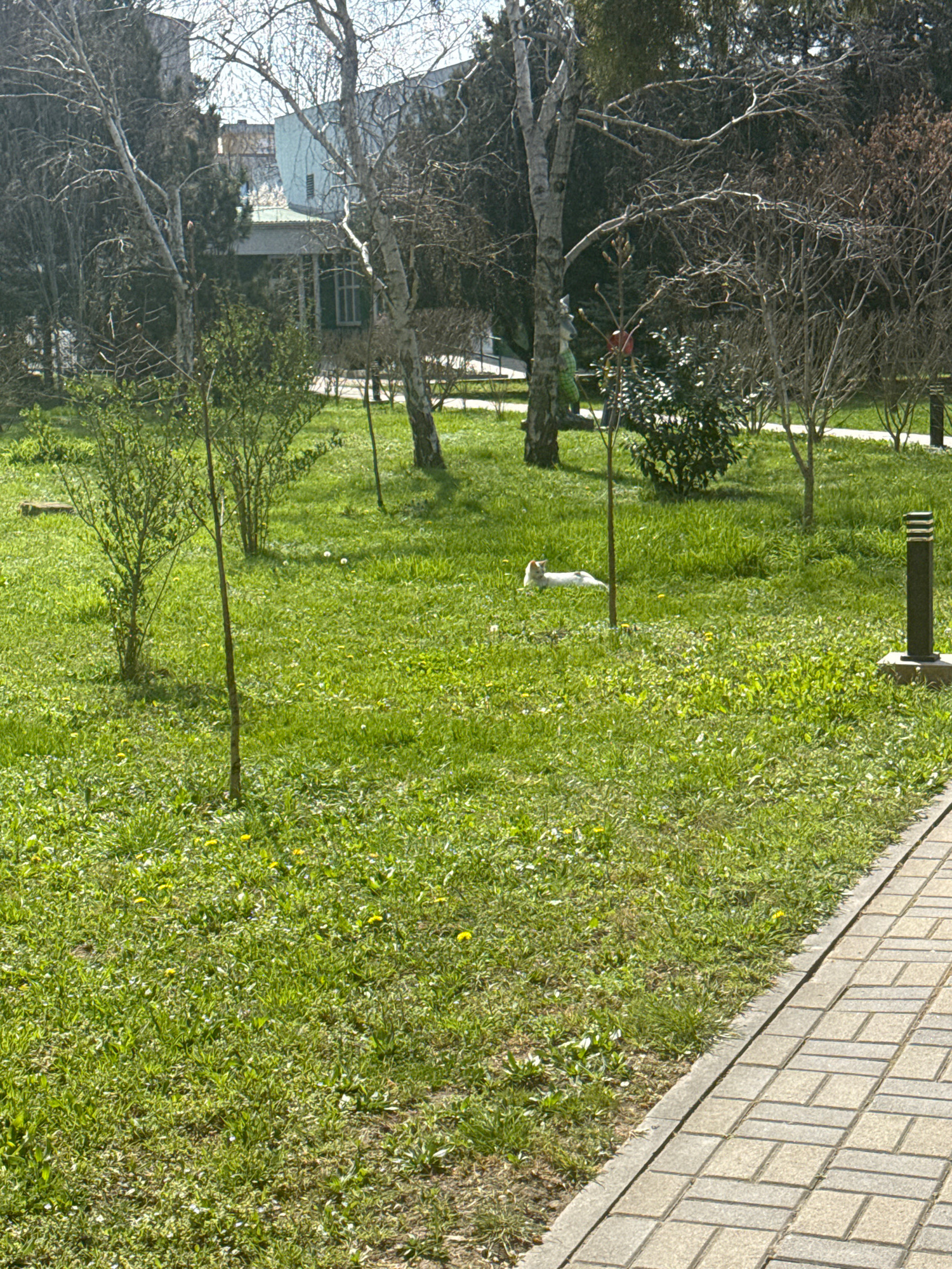 The image shows a park in Anapa, Russia. A green lawn stretches across the majority of the frame, dotted with small yellow and white flowers. A brick pathway runs along the right edge of the frame. Se…read more