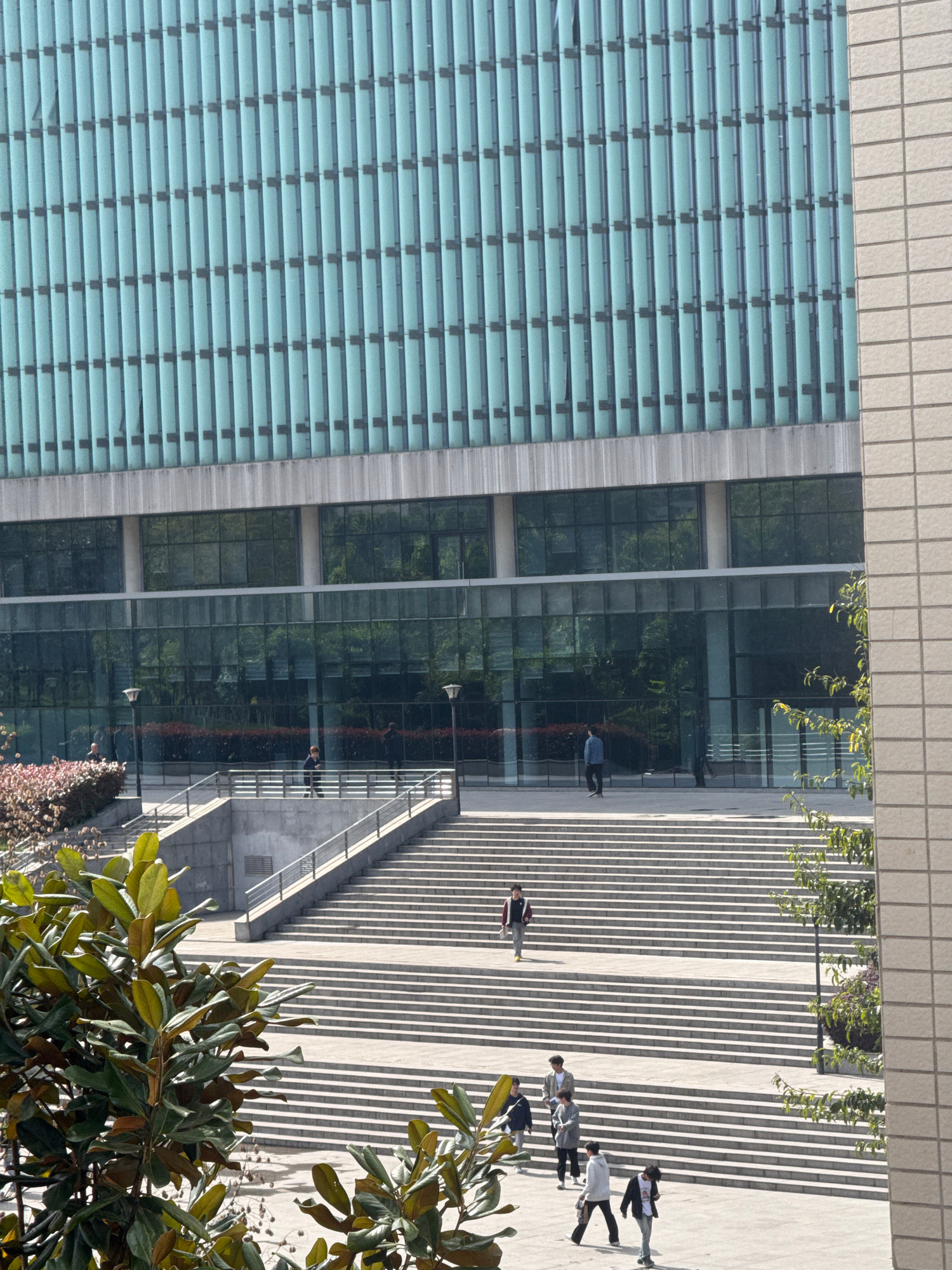 The image shows an exterior view of a modern building in Jiangjin, China, characterized by a grid of blue-tinted horizontal windows. To the right of the building is a wide set of tiered stairs, creati…read more