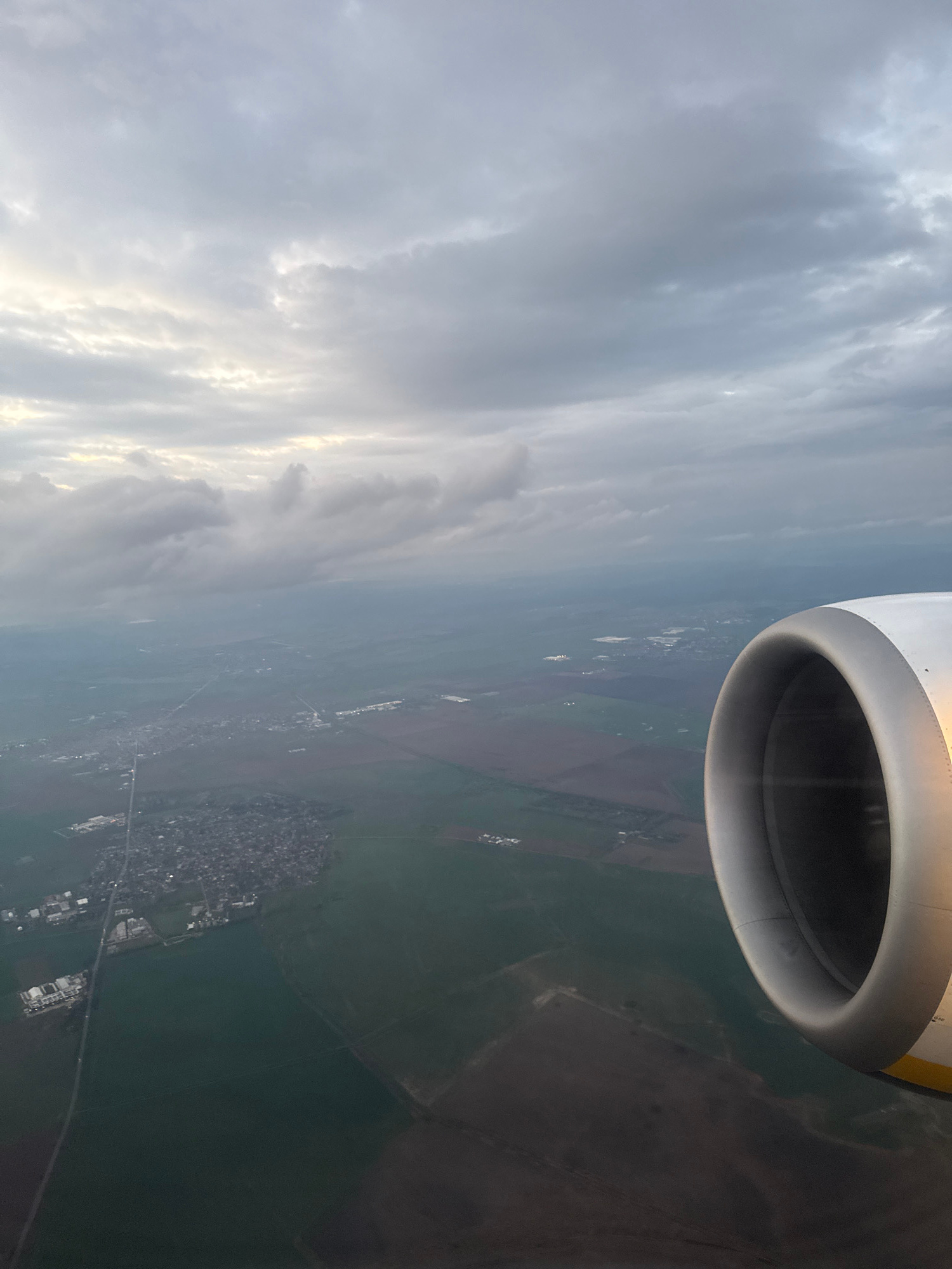 An eye-level, outdoor shot shows the sky with many clouds on the left, the land on the right, and part of a plane engine above. The city of Vecsés, Hungary can be seen in the center of the image. The…read more